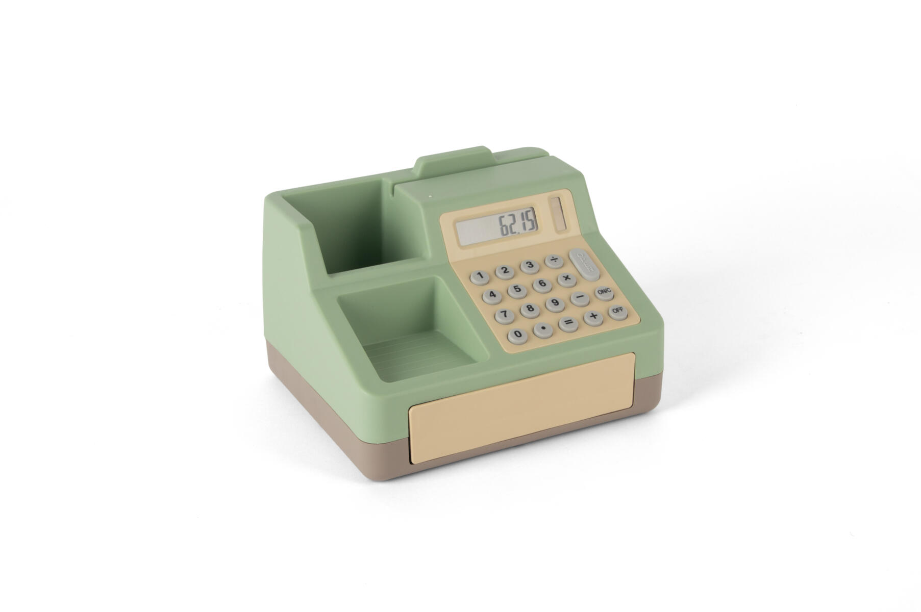 Robust og holdbart kasseapparat. Mål: 26x14x23 cm. Indbygget digital regnemaskine med tydeligt display. 1 stk. batteri medfølger, som oplades ved hjælp af solcellerne. Pengesedler og mønter medfølger. Fra 3 år.