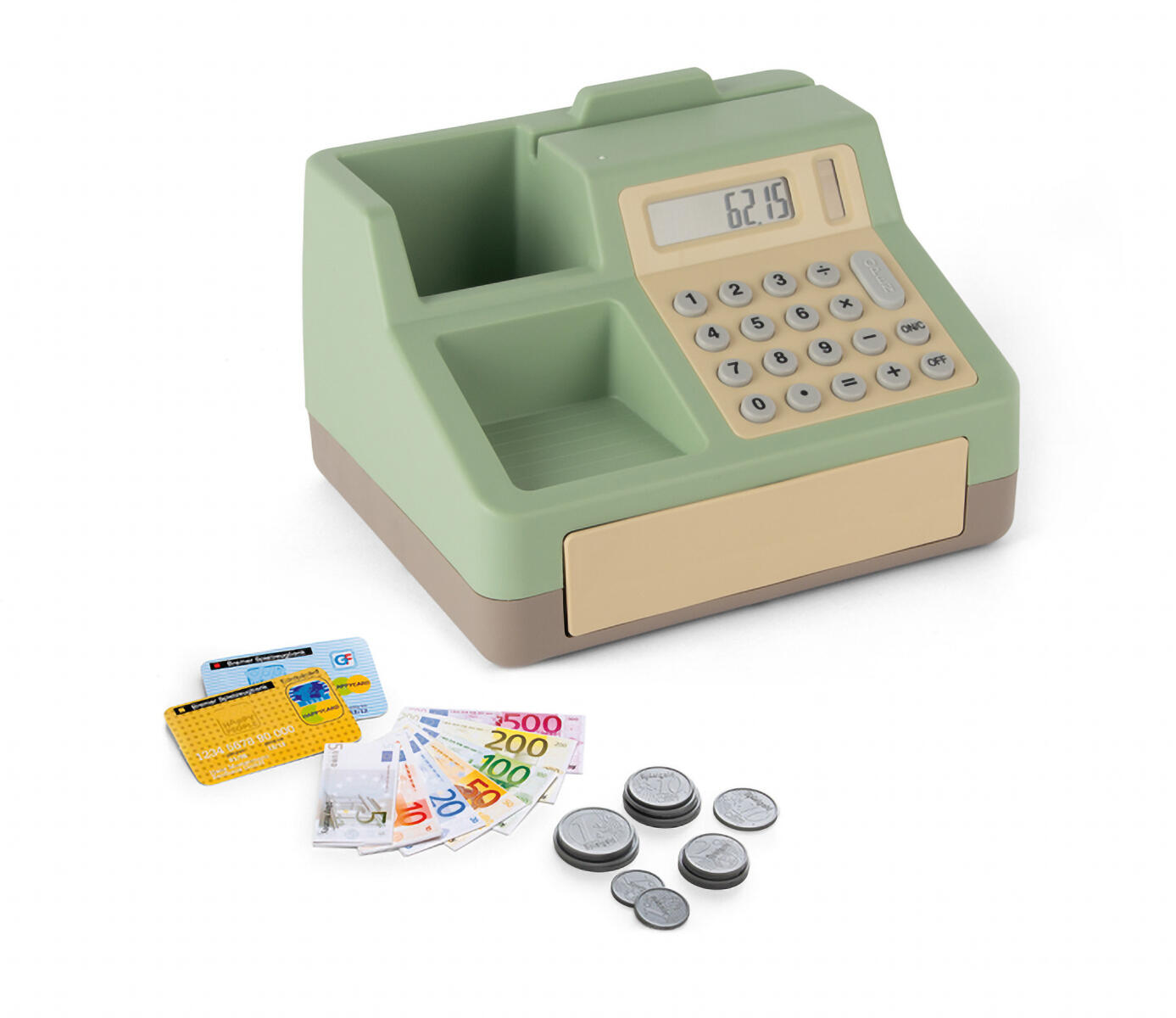 Kasseapparat, som stimulerer børns rolleleg og udvikler deres forståelse for tal, penge og sociale interaktioner. Udstyret med en solcelledrevet lommeregner, som ikke kræver batteriskift. Legepenge medfølger. Af HDPE og ABS. PVC-fri. Fra 3 år.