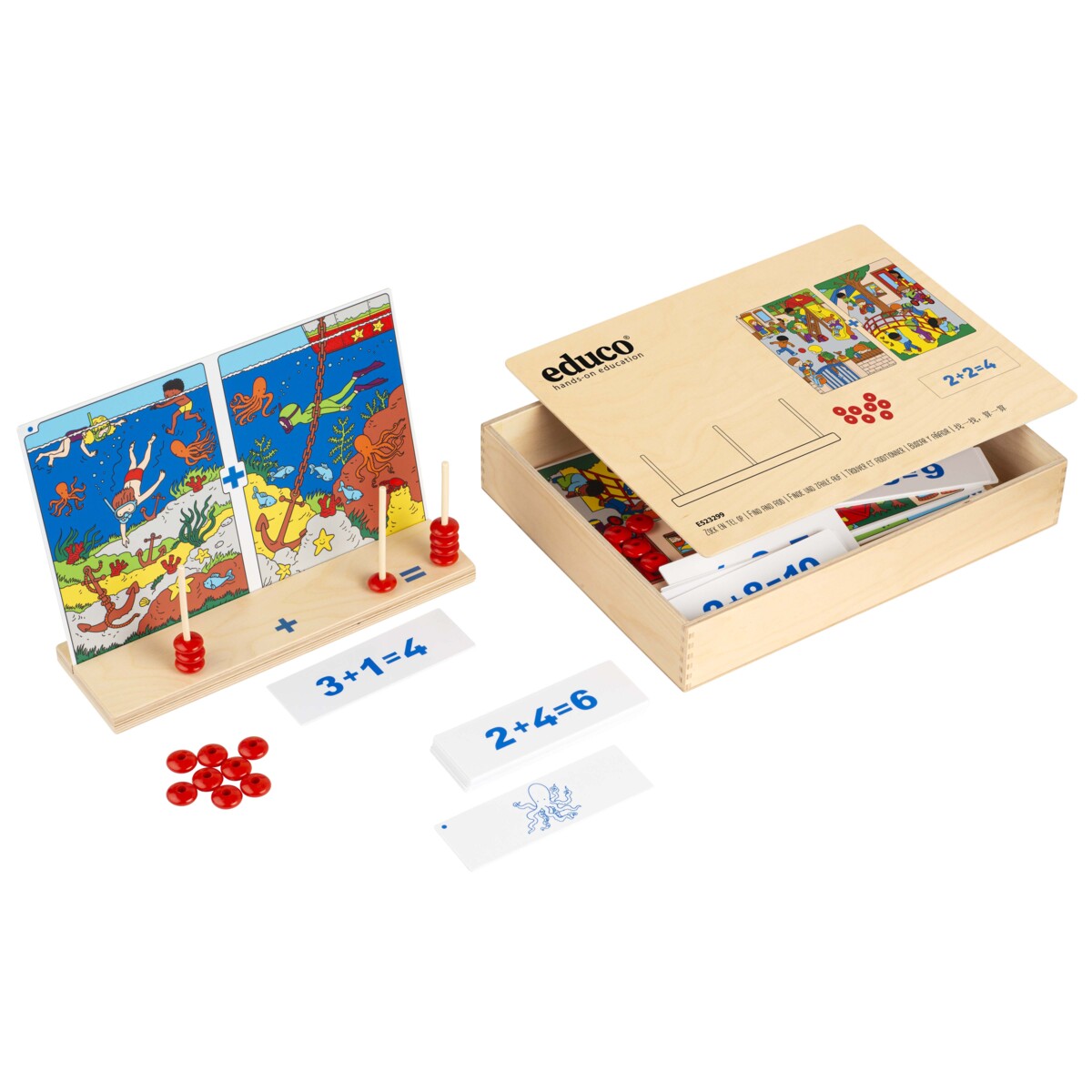 4 temakort i plast, 24 opgavestrimler i plast, 60 plastperler, 2 træstativer og trækasse til opbevaring. Søg efter opgavestrimlen på temakortet. For hver genstand der findes på det venstre billede, placeres en perle på den første stang. Se derefter på det højre billede, tæl genstandene og træk det antal perler på den anden stang. På den tredje pind lægger du det samlede antal perler. Vend opgavestrimlen for at se svarene vist i tal. Materialet stimulerer til tælling og talopfattelse op til 10 på en konkret og sjov måde. Mål trækasse: 33,5x22,5x7 cm. Fra 4 år.