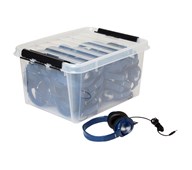 15 stk./pk. AE-54 hovedtelefoner i opbevaringskasse. Praktiske og holdbare hovedtelefoner med lydreducerende ørekopper og minimalt lydudslip. Slidstærk kabel med forstærkede tilslutninger, der er modstandsdygtig over for bid. Hver ledning er udstyret med en lille velcrostrop, så kablerne nemt kan rulles sammen og opbevares uden sammenfiltring. Fra 5 år.