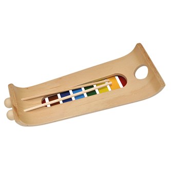 Dette klokkespil har en resonanskasse, som giver en klar og kraftig tone. Klangstavene af metal er stemt C-C. Integreret opbevaring af køllerne. Mål: 24,5x10,5x4,5 cm. Fra 4 år.