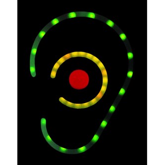 Afgiver et iøjnefaldende alarmsignal (rødt øre), når lydniveauet overstiger de grænser, du har angivet. Du kan nemt selv indstille støjniveauet i 16 forskellige trin mellem 40 og 115 dB ved hjælp af en drejeknap på bagsiden. SoundEar® 2000 advarer med et gult øre lige inden støjgrænsen er nået og dækker et område på 20-25 m². Tilsluttes en almindelig stikkontakt med den medfølgende transformer. Mål: 28x28x5,5 cm.