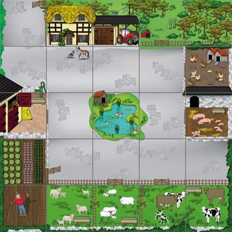Programmer robotten til at besøge forskellige steder på bondegården. Kør f.eks. først ud til køerne og derefter til laden. Find ud af, hvor mange tryk på knappen det kræver. Opgaven giver et samspil mellem naturvidenskab, læse- og skrivefærdigheder og informations- og kommunikationsteknologi. Mål: 75x75 cm. Af PVC, uden forbudte ftalater.