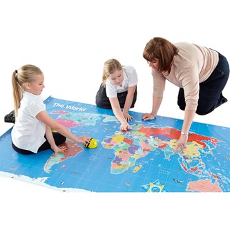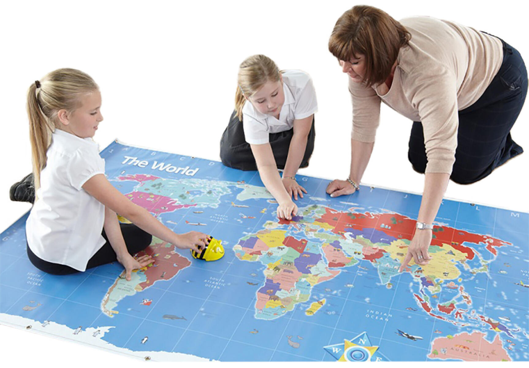 Lad Bee-Bot og Blue-Bot være med på en rejse verden rundt. Verdenskortet viser hav, kontinenter, hovedstæder og andre store steder. Af PVC uden ftalater. Engelsk tekst. Mål: 120x210 cm.