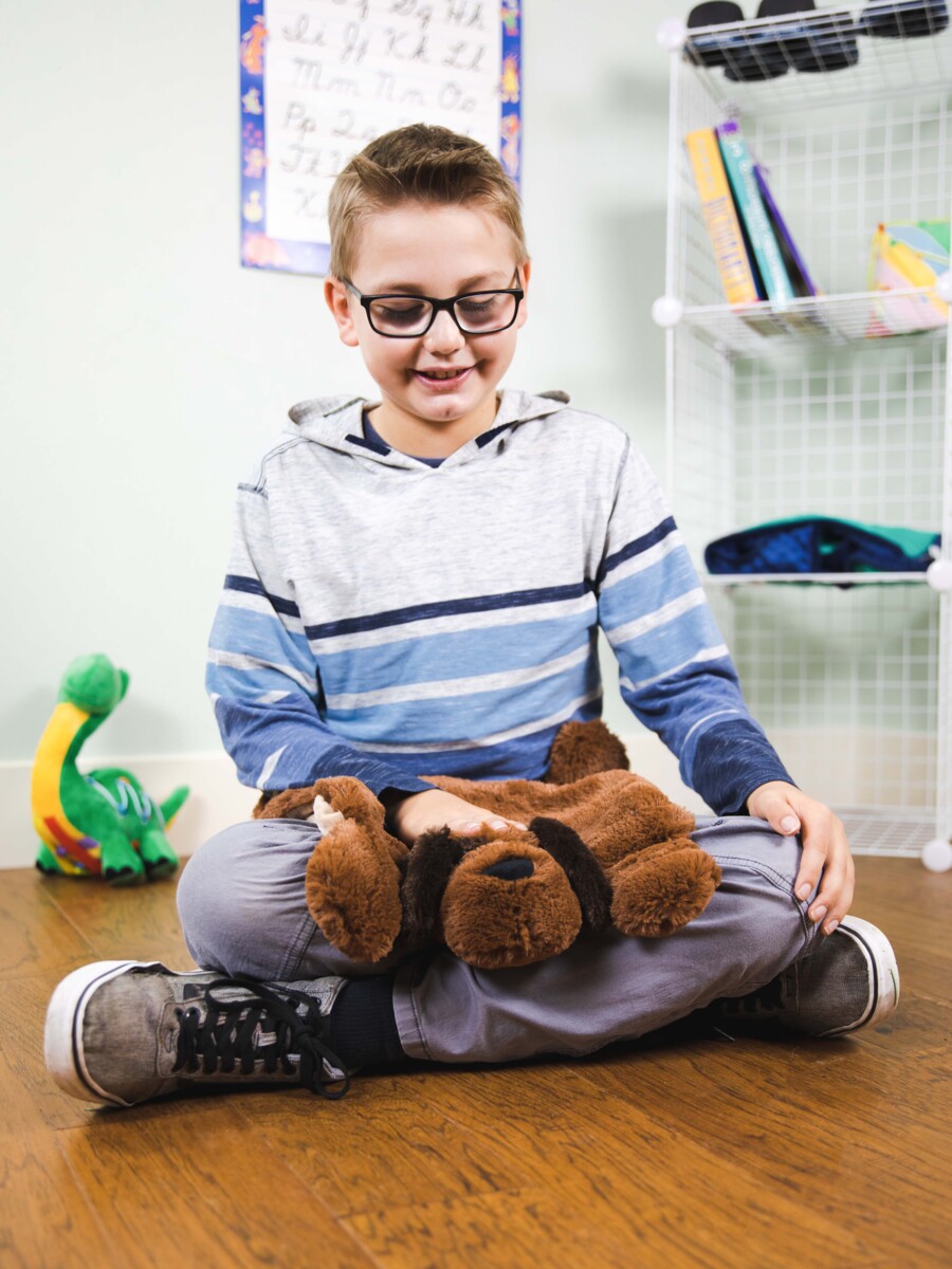 En blød hund, som er specielt designet til at være en støttende ledsager. Den har en let vægt, er luftig og giver tryghed til børn med behov for sanseudvikling. Den kan ligge på barnets skød eller skuldre eller bare sidde ved siden af. Den kan også anvendes til ældre mennesker. De forskellige dele har forskellige teksturer, hvilket giver en taktil oplevelse. Den har en pose med keramiske perler i maven, der kan varmes i mikrobølgeovnen eller lægges i fryseren. Vægt: 1,1 kg. Materiale: Polyester. PVC-fri. Fra 3 år.