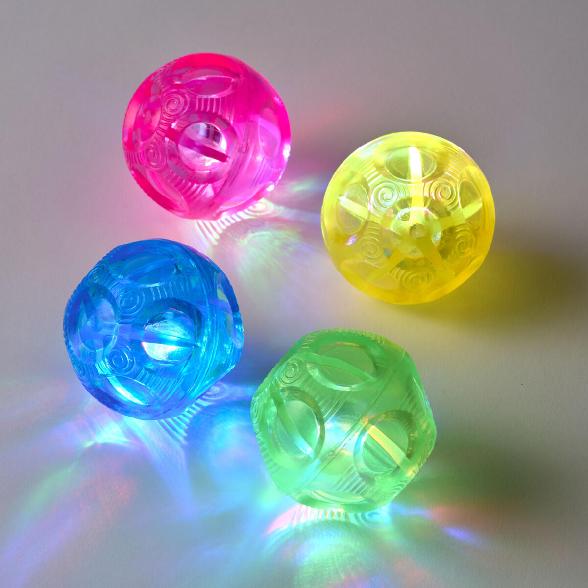 Bolde som lyser op og blinker, når de kastes. Boldene har en ujævn overflade, som buler ud og bøjes i skæve vinkler, når de rammer gulvet. 4 lyse farver: blå, rosa, gul og grøn.