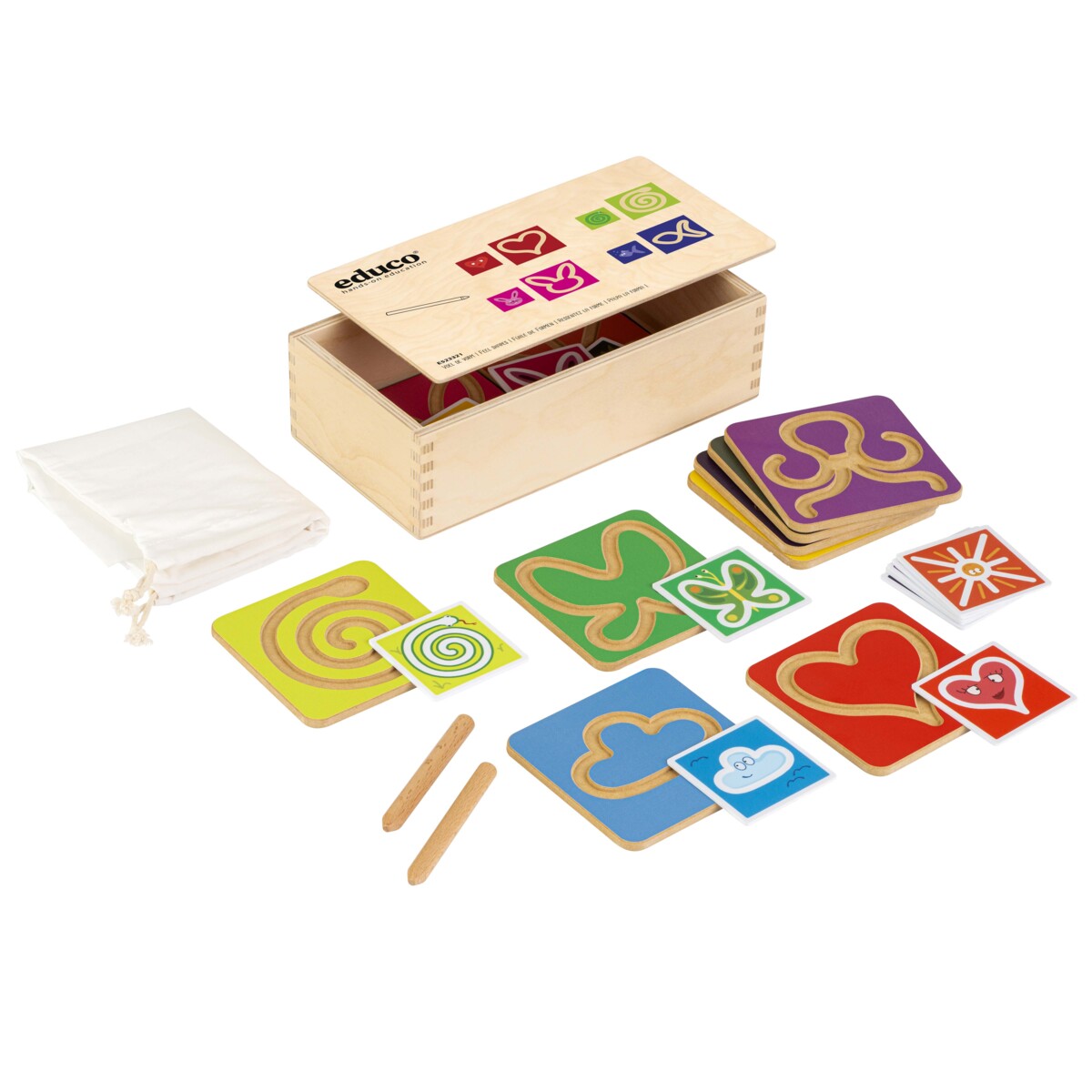 12 træbrikker med indgraverede former, 12 plastkort med billeder, 2 træpenne, stofpose og 1 trækasse til opbevaring. Taktilt materiale, der kan bruges på flere forskellige måder. Genkend former på ryggen, i en pose, skrevet i luften eller spil som et hukommelsesspil. Udvikler grov- og finmotorik, opfattelsesevne og tidlige skrivefærdigheder. Manual på engelsk inkluderet. Mål: træbrik 10x10 cm, plastkort 6x6 cm, træpenne 9 cm, Ø 1 cm, stofpose 23x26cm, trækasse 24x12,5x7 cm. Fra 3 år.