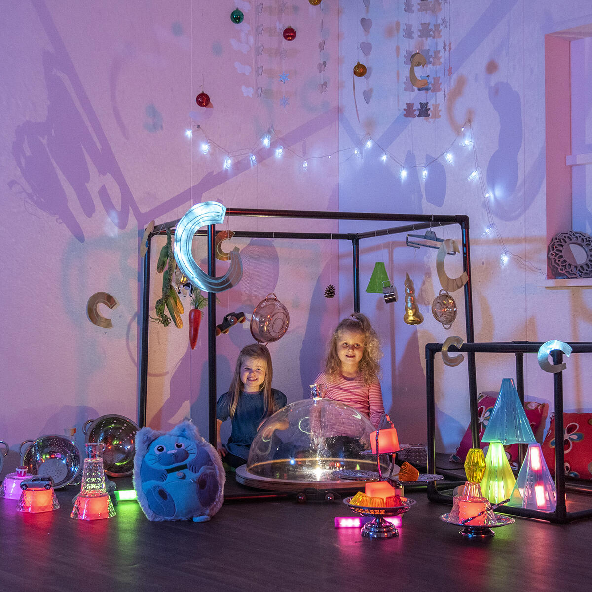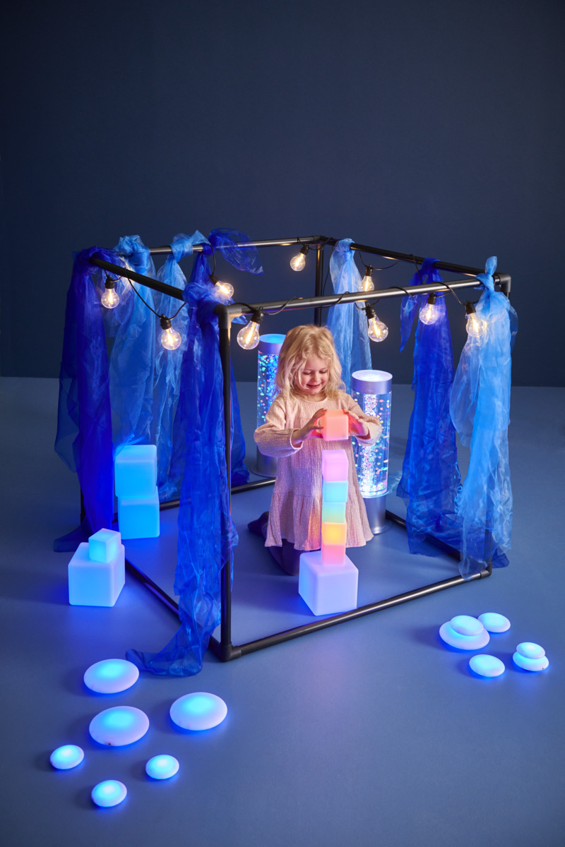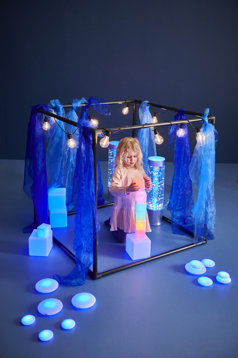 En fleksibel måde at bygge et sanserum på. Du kan projicere hvad som helst på vægge og loft. Det er også lettilgængeligt, selvom man f.eks. sidder i kørestol. Her kan man slappe af, få energi eller undersøge noget. I hvert hjørne er det muligt at hænge ting op for yderligere stimulering. En opbevaringspose medfølger. Mål: 142x142x142 cm.