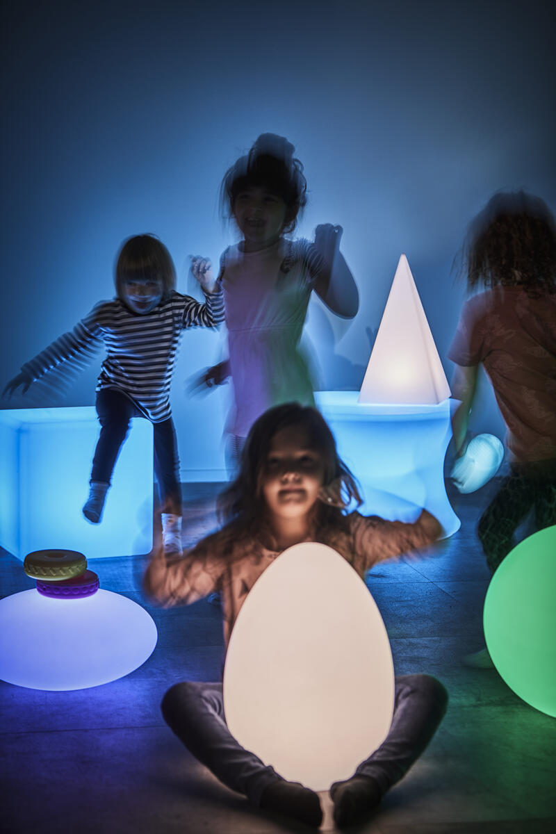 Lav et rum til stille udforskning af de forskellige sanser. Med den smukke pastelfarvede form, som kan skifte mellem 16 forskellige farver, bliver atmosfæren rolig og stemningsfuld og lokker til videre udforskning og oplevelser. Med en fjernbetjening kan farven på lyskilden indstilles til en konstant farve eller en langsom farveændring. Bolden kan oplades og har en vandbestandighed klasse IP65. Den tåler belastninger på op til 80 kg. Lyskuglen er batteridrevet og kan oplades i en standard stikkontakt. Med et fuldt opladet batteri kan den lyse i 5-8 timer afhængig af programmet. Opladning foregår via den sikre lavspændings 5V DC enhed, der medfølger. Efter 8 timers opladning kan den bruges, hvor det er nødvendigt. Ekstra strømledning/adapter til vores lysende former: 116666. Mål: bredde 40 cm. Fremstillet af PE, ABS.