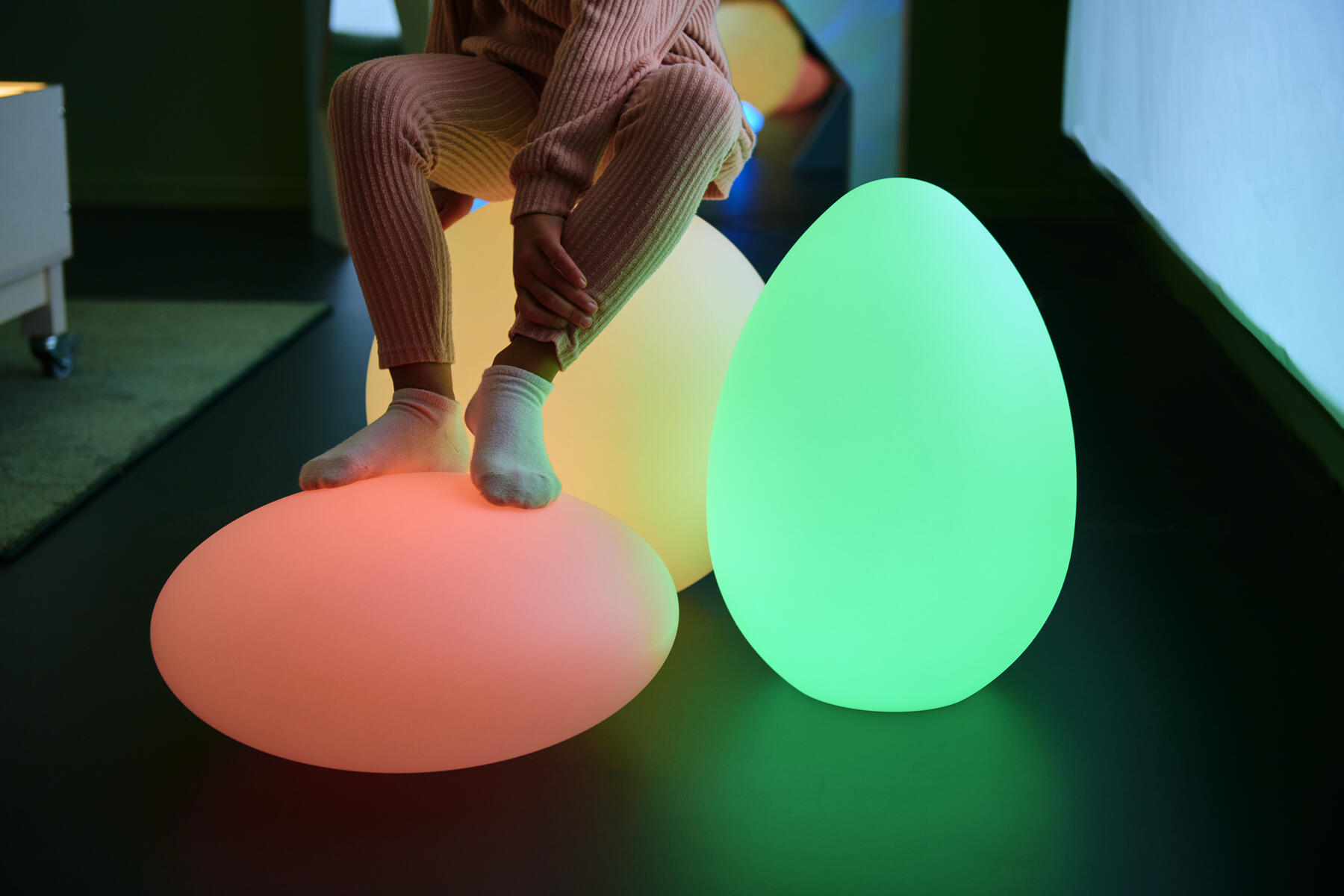 Lav et rum til stille udforskning af de forskellige sanser. Med den smukke pastelfarvede form, som kan skifte mellem 16 forskellige farver, bliver atmosfæren rolig og stemningsfuld og lokker til videre udforsking og oplevelser. Med en fjernbetjening kan farven på lyskilden indstilles til en konstant farve eller en langsom farveændring. Ægget kan oplades og har en vandbestandighed klasse IP65. Den tåler belastninger på op til 80 kg. Lysægget er batteridrevet og oplades i en standard stikkontakt. Med et fuldt opladet batteri kan den skinne i 5-8 timer afhængig af programmet. Opladning foregår via den sikre lavspændings 5V DC enhed, der medfølger. Efter 8 timers opladning kan den bruges, hvor det er nødvendigt. Ekstra strømledning/adapter til vores geniale former: 116666. Mål: Højde 32 cm, bredde 22 cm. Fremstillet af PE, ABS.