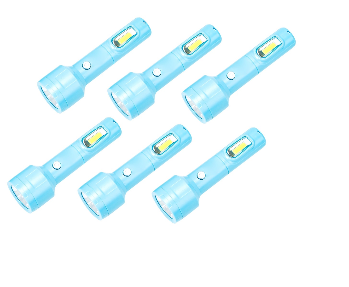 6 stk/pk. Genopladelige LED-lommelygter der oplades med et USB-kabel. Hver lommelygte kommer med et USB-kabel i pakken. LED-lysene giver et lys i op til 5 timer. Mål 4,5 x 11 cm.
