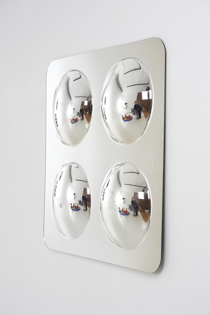 Ridsefrit akrylspejl. De fire konvekse udbulinger er spændende at spejle sig i og undersøge, hvordan billedet forvrænges. Spejlene kan placeres på en plan flade både inden- og udendørs. Hjørnebeslag og klæbepuder medfølger. Mål 49x49 cm.