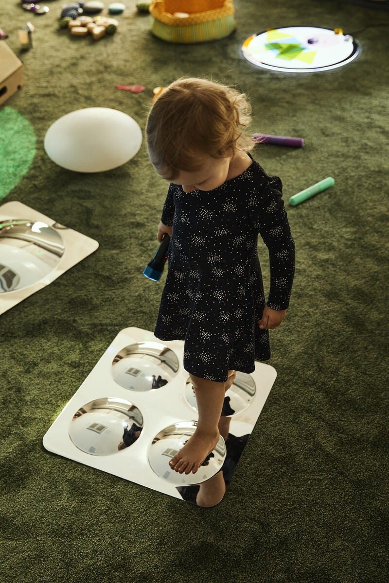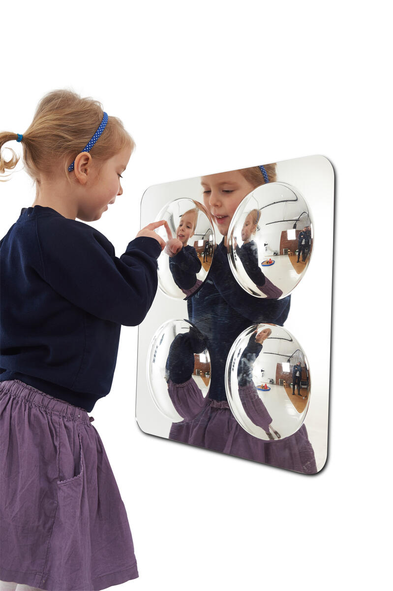 Et spejl med 9 konvekse kupler som giver sjove effekter og former, når barnet spejler sig. Kan sættes op på en glat flade både inde og ude. Selvklæbende puder og kroge følger med. Mål: 49x49 cm. Af akrylplast.