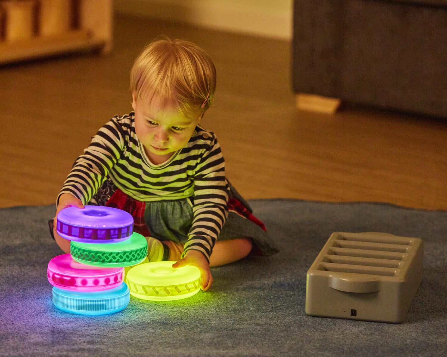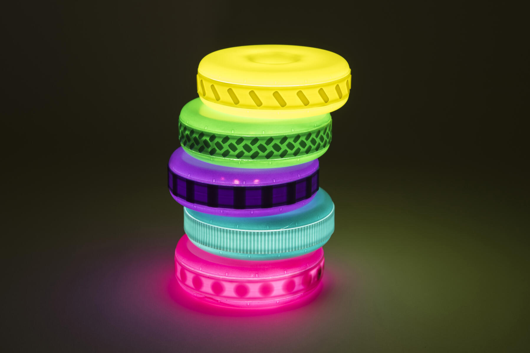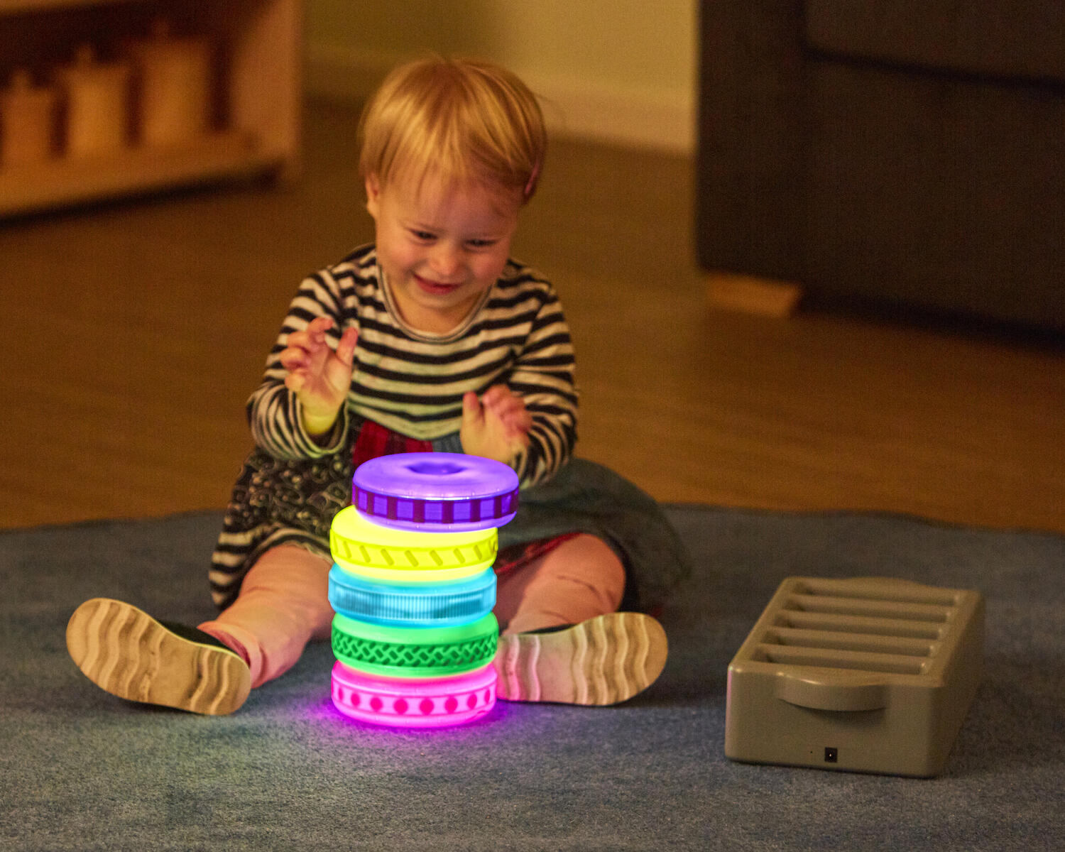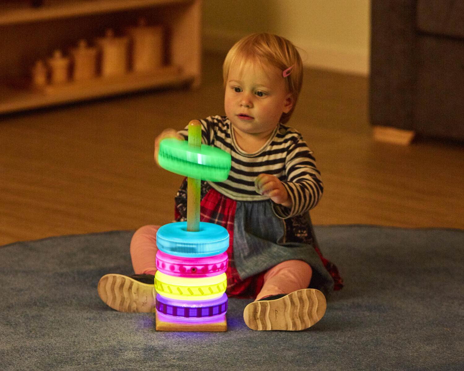 Brug disse lysende ringe til at bygge med. De kan oplades og lyser i 1 minut, når man ryster dem. Hver ring har forskellig struktur på ydersiden, som er spændende at føle på. De mindste børn kan nemt bygge dem op i højden (pind medfølger ikke). Inkluderer også en dockingstation, hvor man kan oplade alle 5 ringe. Fra 10 måneder.