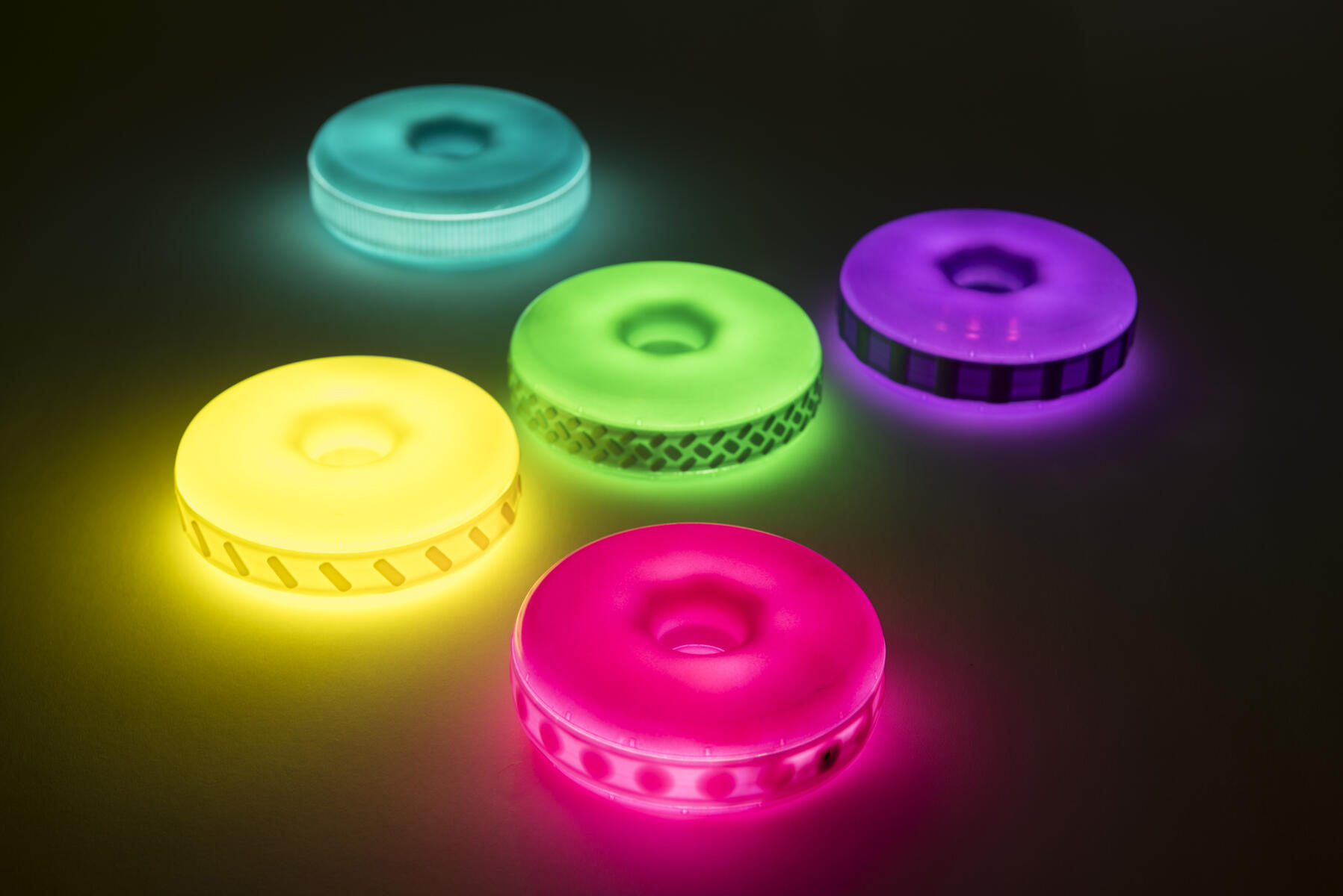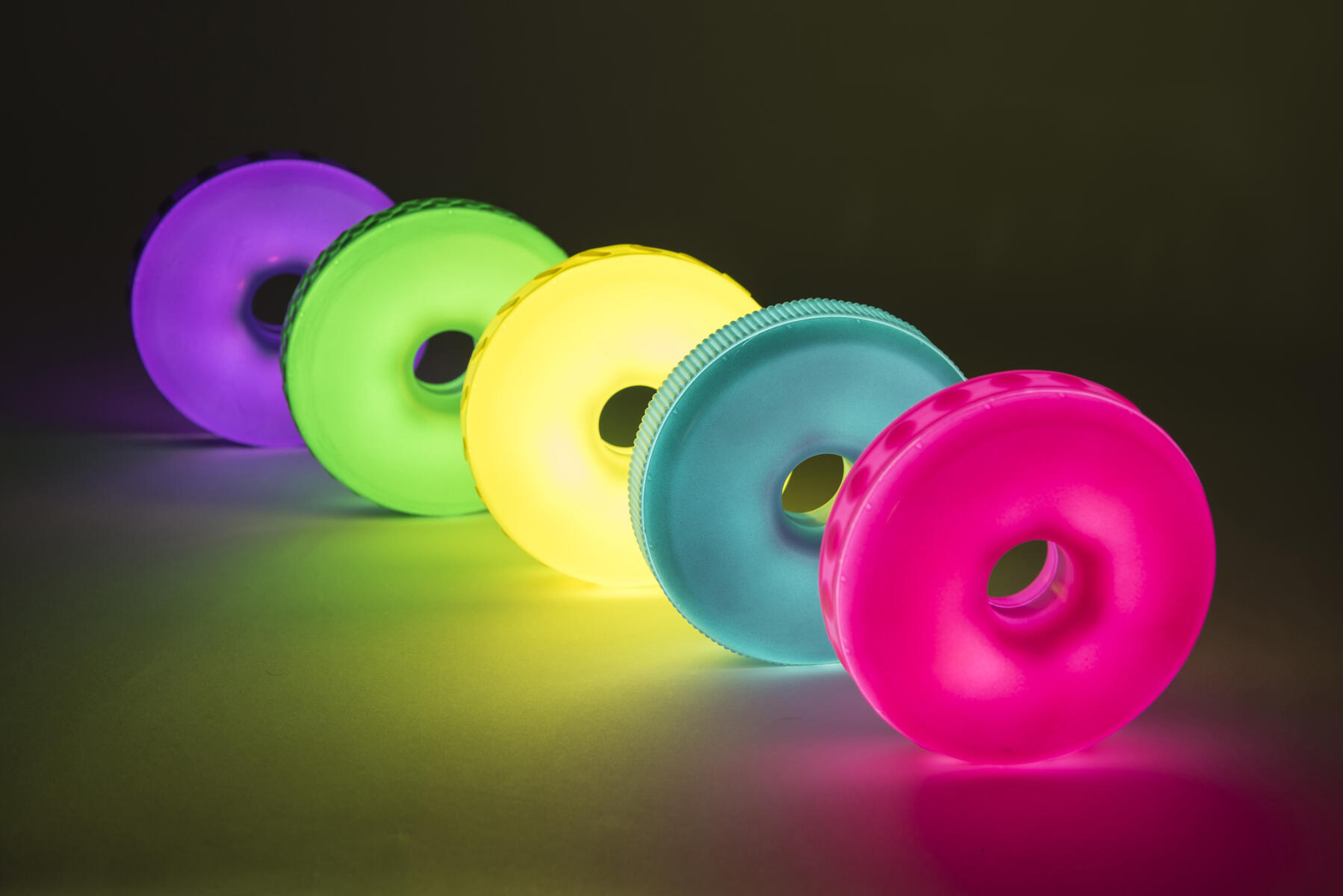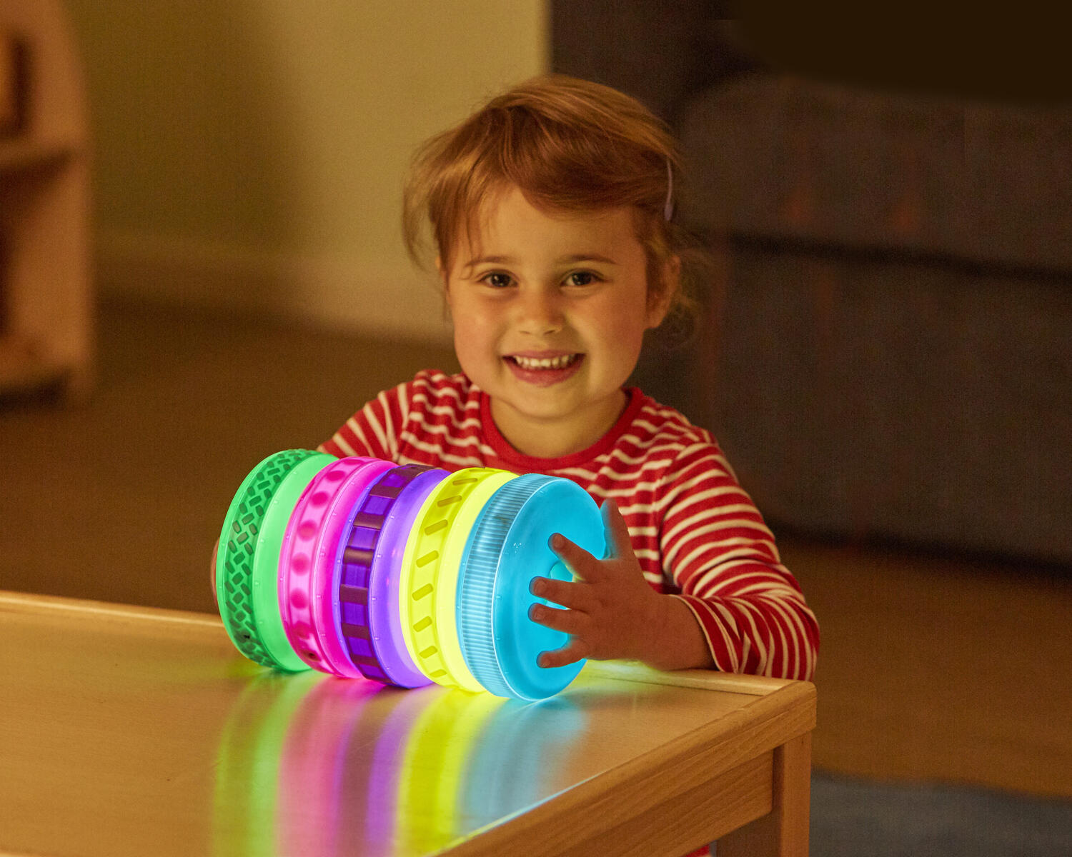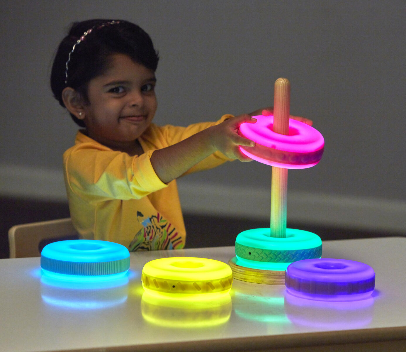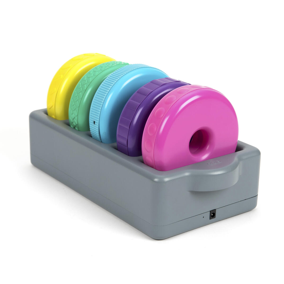 Brug disse lysende ringe til at bygge med. De kan oplades og lyser i 1 minut, når man ryster dem. Hver ring har forskellig struktur på ydersiden, som er spændende at føle på. De mindste børn kan nemt bygge dem op i højden (pind medfølger ikke). Inkluderer også en dockingstation, hvor man kan oplade alle 5 ringe. Fra 10 måneder.