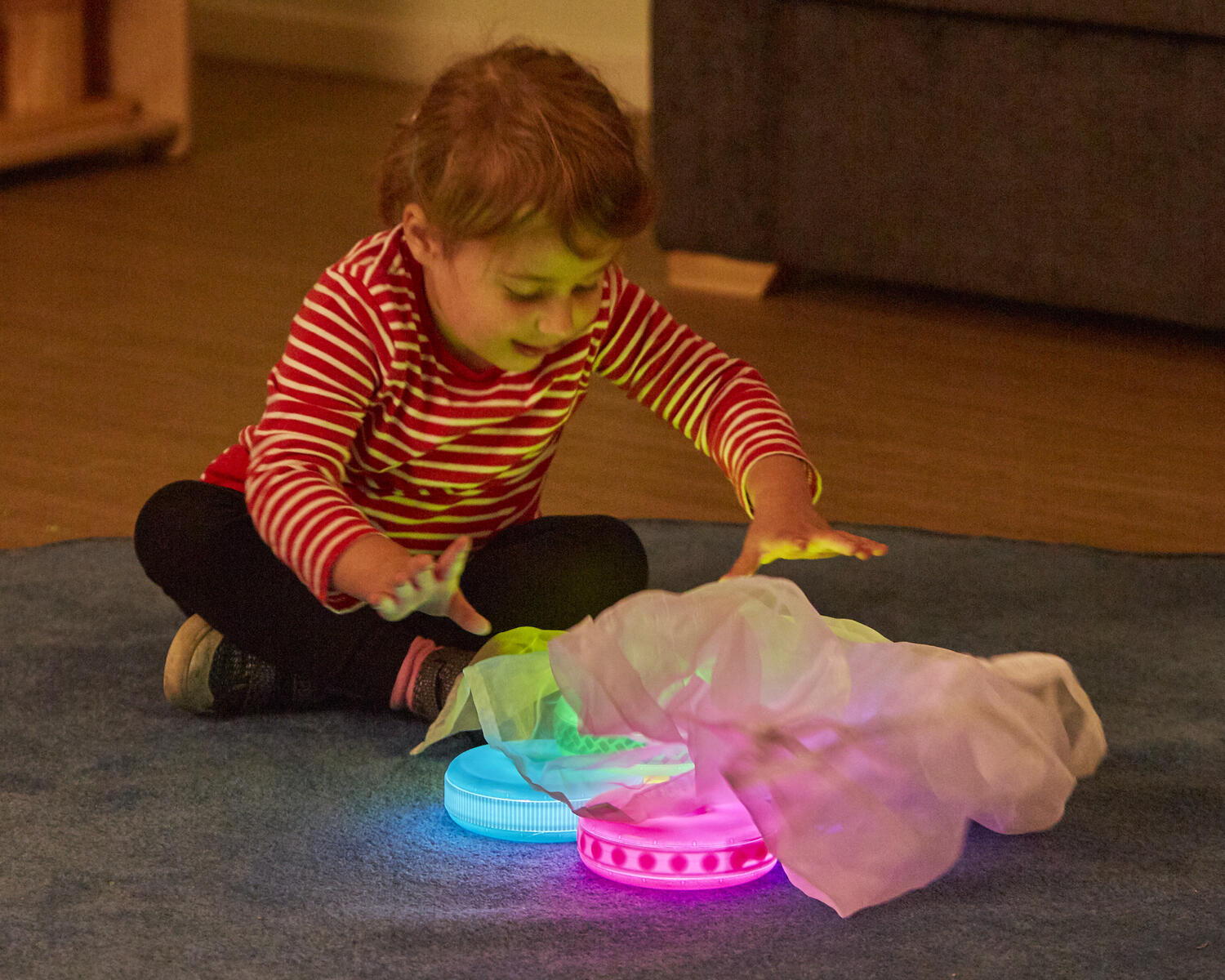 12 stk./pk. Et sæt med genopladelige og selvlysende, runde sten, der kan stables, rulles og sorteres. En fantastisk ressource til sensoriske oplevelser og en ny måde at opmuntre børn til at eksperimentere på. Vælg mellem at vise et spektrum af farver, der skifter automatisk, eller indstil en af de 7 faste farver. Forvandl et almindeligt rum til et sanserum og en kreativ læringsmiljø på ingen tid. Lyser i ca. 10–12 timer efter opladning. 3 forskellige størrelser, mål: ø 4,5–15 cm. Af ABS. PVC-fri. Fra 1 år.