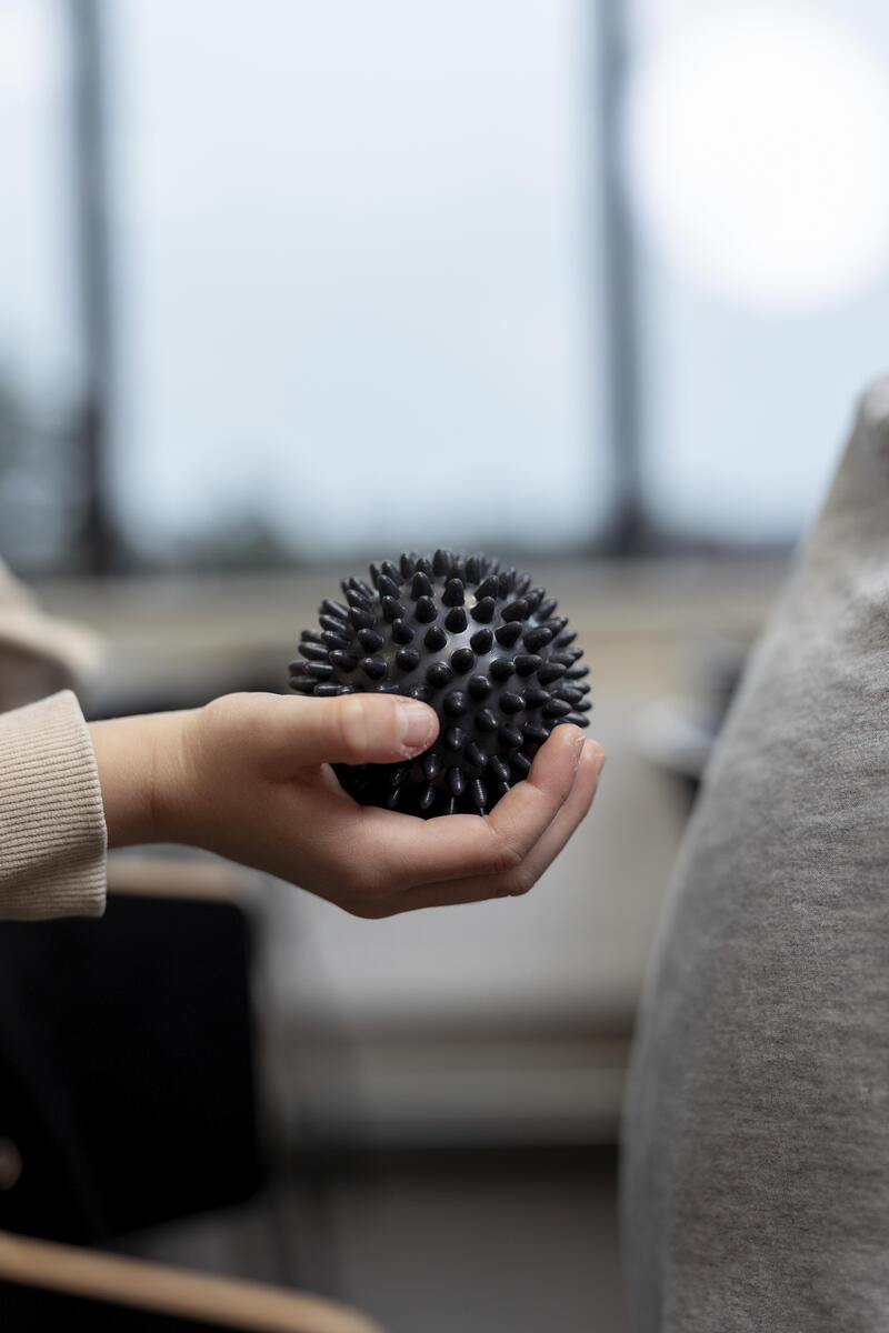 Ergonomisk og taktil massagebold, som giver øget blodcirkulation og stimulerer følesansen. Gribevenlig og kan rulles over hele kroppen, og man kan bruge den på sig selv eller andre elever. God at holde i hånden for at øge koncentrations- og indlæringsevnen hos elever, der har svært ved at sidde stille. Modstand: Hård. Mål: ø 8 cm. Materiale: TPR. PVC-fri.