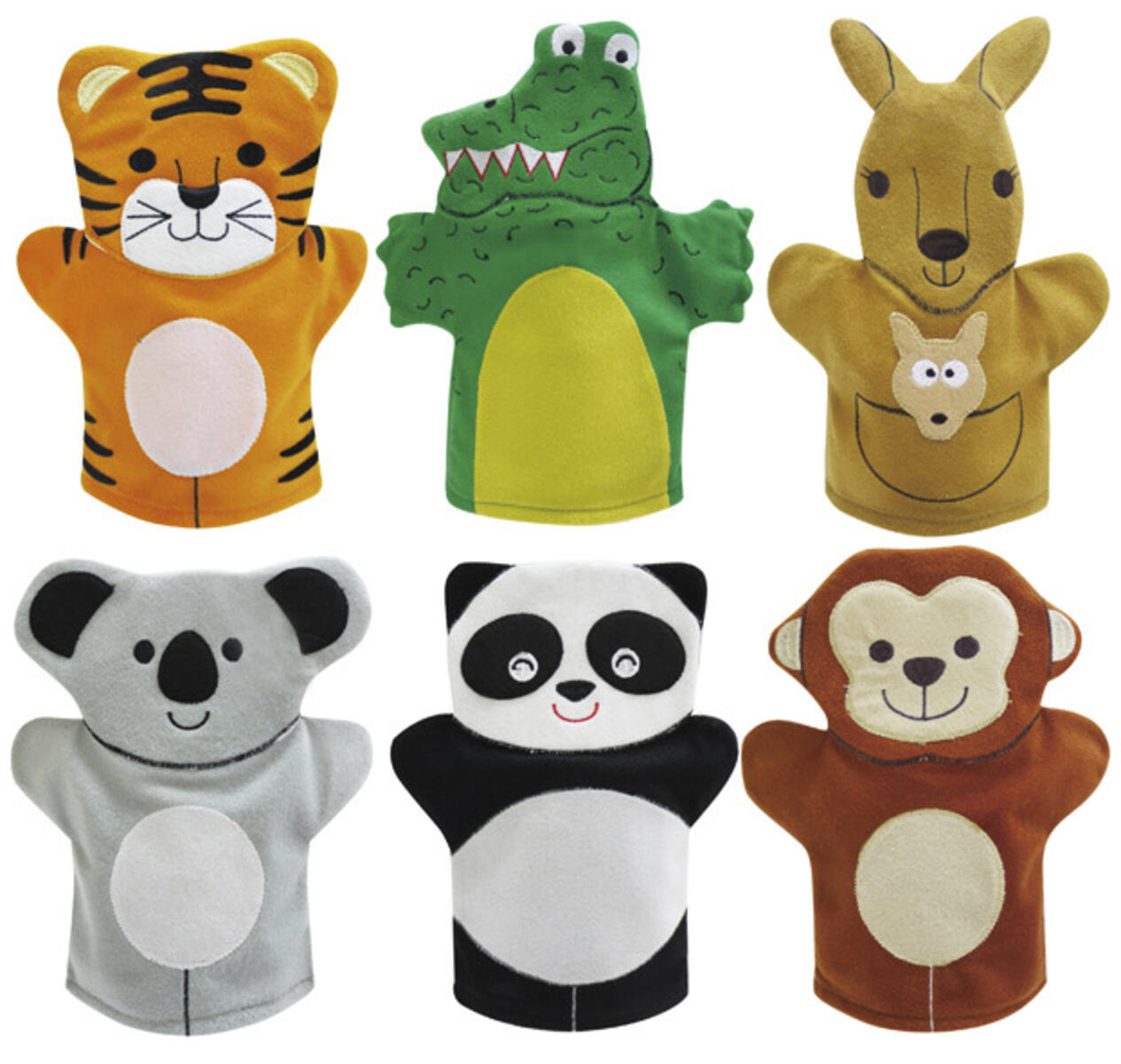 6 stk./pk. Sprogudviklende hånddukker i blødt materiale. Indeholder en tiger, en krokodille, en koalabjørn, en panda og en abe. Af polyester. Maskinvask 30°C. Længde ca. 28 cm. Fra 3 år.