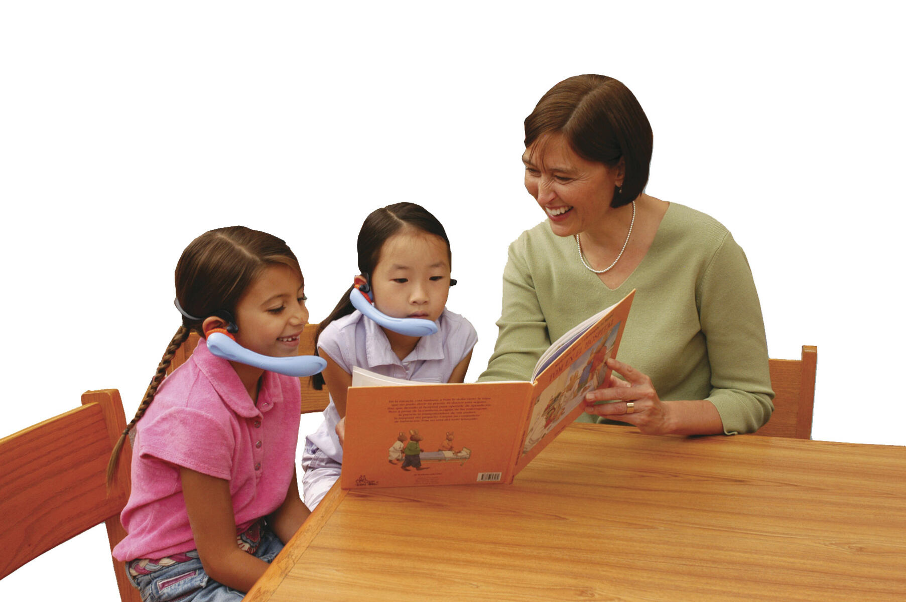 Ved at bruge en hvisketelefon når du læser eller taler, får du en akustisk stemmeafspilning, som lader barnet fokusere og høre fonemet tydeligere, når de lærer at læse. Du hører fonemer 10 gange tydeligere og også over baggrundslyde. Her er også et headset, som gør, at man har begge hænder fri.