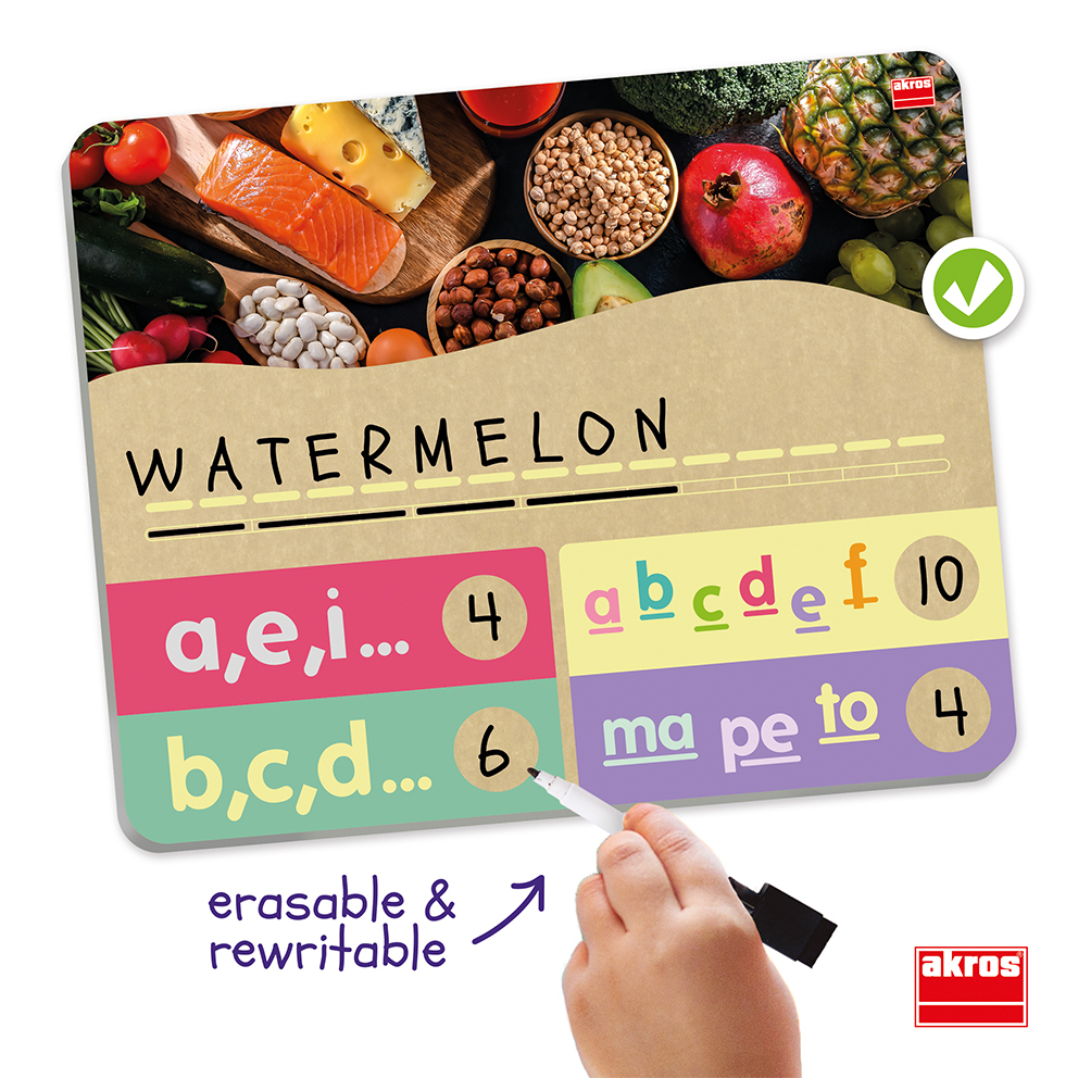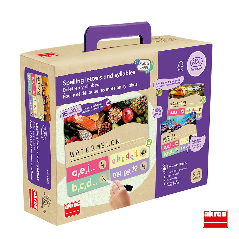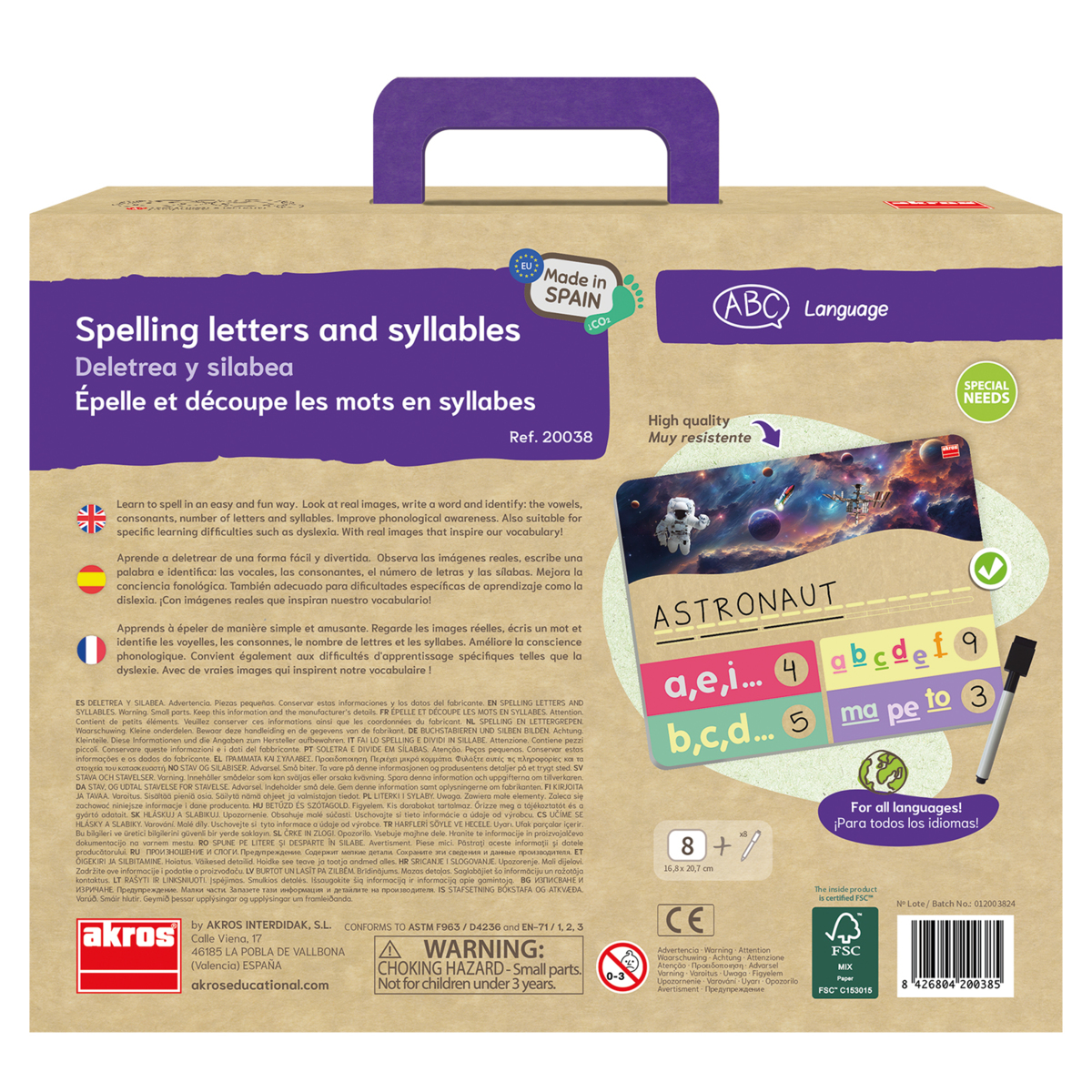 Lær at stave på en sjov og enkel måde. Se på billedet, skriv et ord, og identificer vokaler, konsonanter, antal bogstaver og stavelser. Understøtter fonetisk udvikling. Særligt velegnet til børn med fx dysleksi. Indeholder 8 skriveplader og 8 whiteboardtuscher. Skriv, visk ud og prøv igen med et nyt ord. FSC. Fra 5 år.