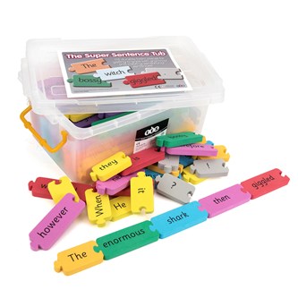 115 puslespilsbrikker med ord og tegnsætning på engelsk. Farverne viser, hvilken ordklasse ordet tilhører. Substantiver=blå, verber=rød, adjektiver=grøn, adverbier=fersken, præpositioner=lilla, pronominer=gule, konjunktioner=rosa, determinativ=gul, punktation=grå.