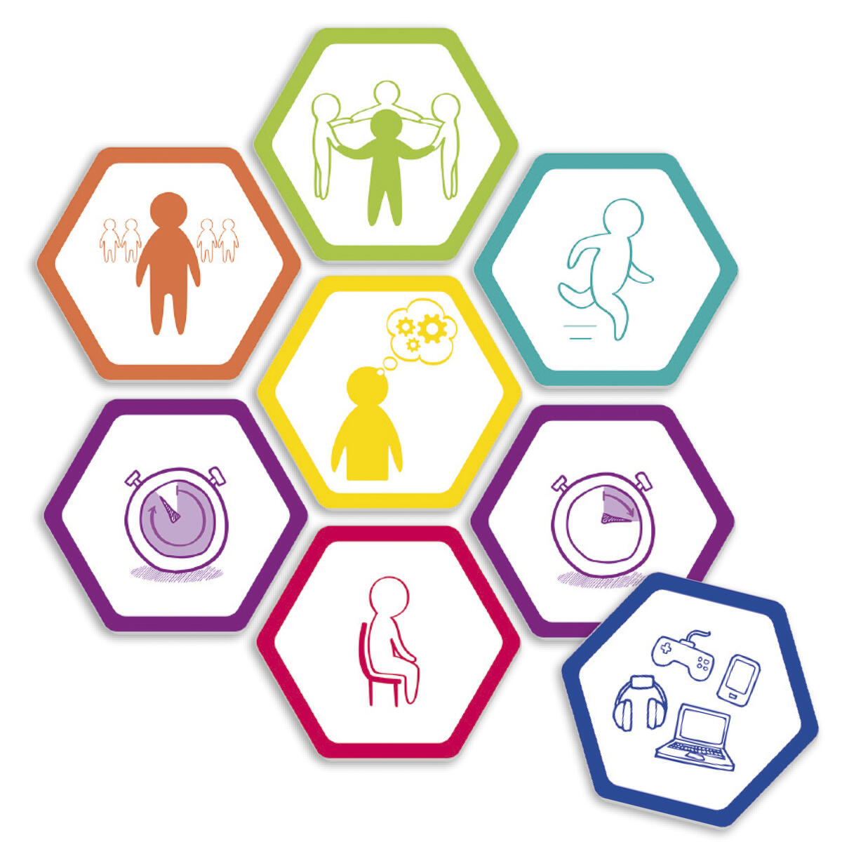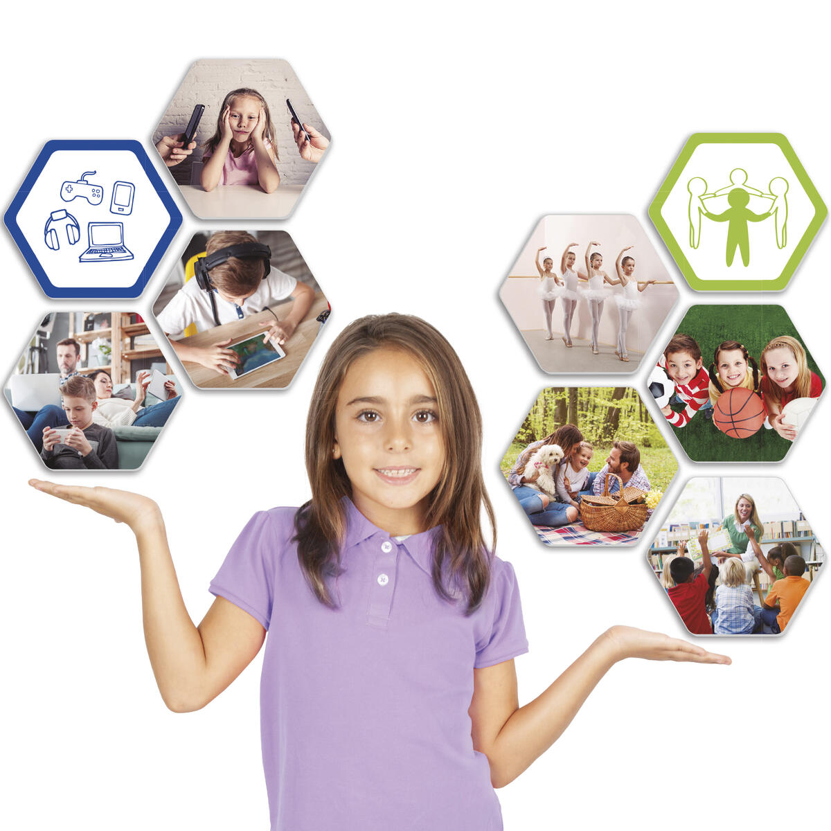 Hjælper børn med at identificere hvilke aktiviteter de normalt udfører, og tænke over, hvordan de kan balancere dem. Formålet med spillet er at få børnene til at forstå risikoen ved at gøre noget for meget og fordelene ved at lave forskellige aktiviteter i fritiden. Indeholder 8 sekskantede kategorikort og 42 sekskantede aktivitetskort. Fra 5 år.