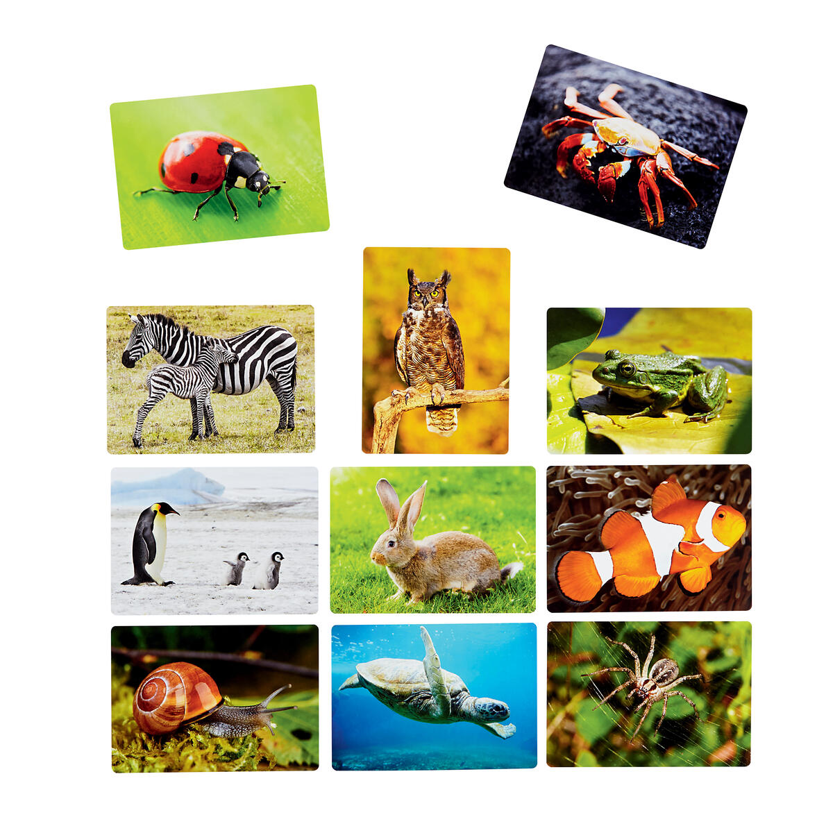 Store sprogudviklende billedkort til at træne navne, begreber og beskrivende ord på dyr og deres miljøer. Boksen indeholder 70 fotografiske billedkort 21x15 cm samt en lærervejledning. Fra 3 år.