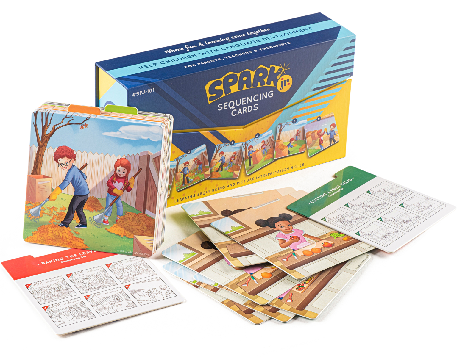 48 kort. Sekvenskort, der fremmer historiefortælling og fantasi. Indeholder 8 historier med 6 kort i hver sekvens. Historierne er "Storm på vej", "Salg af drikkevarer", "Hos dyrlægen", "Ude og spille fodbold", "På tur til biblioteket", "Borddækning", "Plante blomster" og "Strandtur". Øv jer i at artikulere og lave forskellige lyde, udvid jeres ordforråd og lær at genkende strukturen i en historie. Der medfølger en vejledning på engelsk. Fra 3 år.