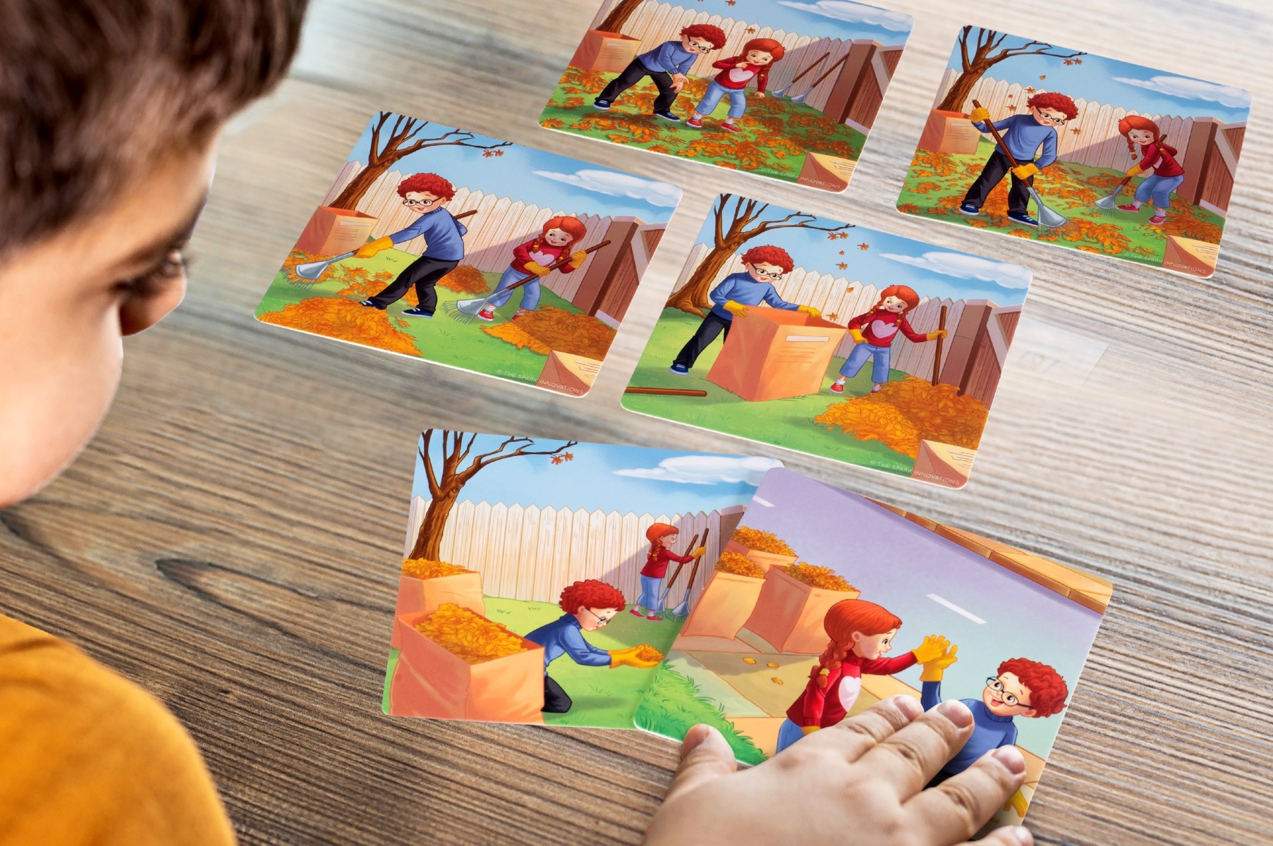 48 kort. Sekvenserne er opdelt i 12 forskellige begivenheder med 4 kort i hver serie. Et godt udgangspunkt for at tale om erhverv. Professionerne omfatter kok, brandmand, pilot, sikkerhedsvagt, dyrlæge, bygningsarbejder, landmand, postbud, læge, skraldemand, politi og bibliotekar. Kortene er laminerede, så man kan bruge en whiteboardmarker til at markere forskellige ting på kortene. Udvikler sprog, kommunikation og kritisk tænkning. Fra 3 år.