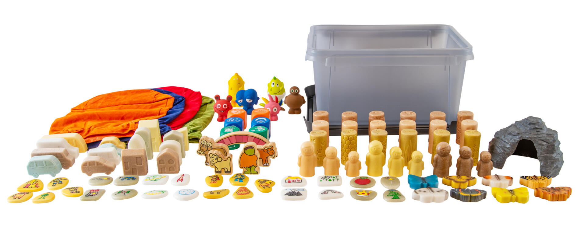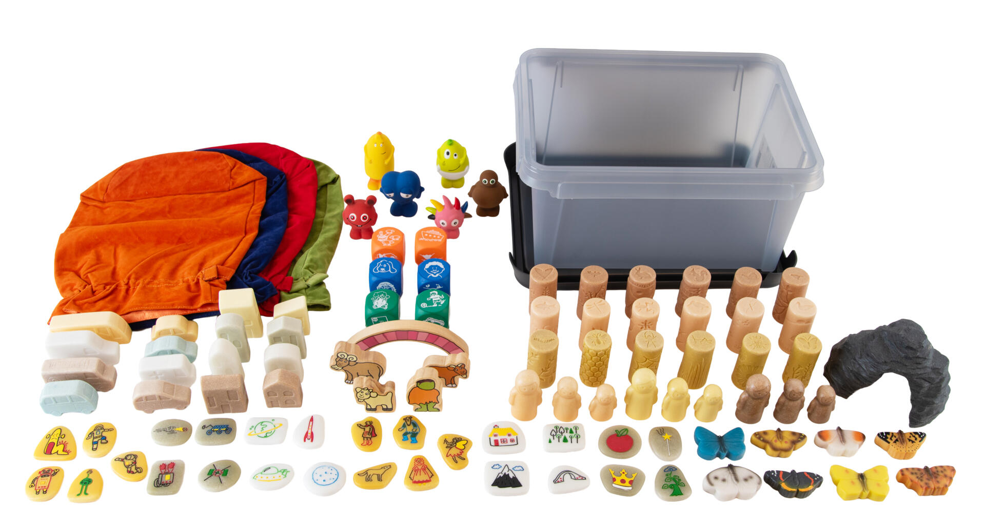Et stort sæt til historiefortælling udendørs. Indeholder bl.a. slidstærke biler, huse, dyr og figurer, som man kan bygge eventyrverdener med i både sol og regn. Med eventyrstenene er det nemmere at fortælle et eventyr, da børnene får hjælp til historien. Den populære historie om De tre Bukke Bruse er sjov at skabe udendørs. Med hjulene kan vi også skabe en scene til forskellige historier – rul dem i vådt sand, stempel figurer og byg historien i fællessab. Babblarna er også inkluderet og kan bruges i sne, regn og sol. Alt kan opbevares i fløjlsposerne og den vejrbestandige opbevaringskasse.