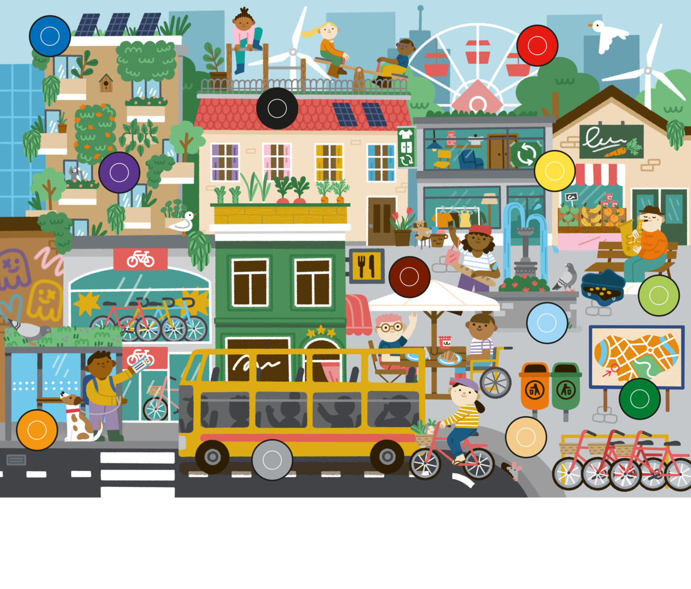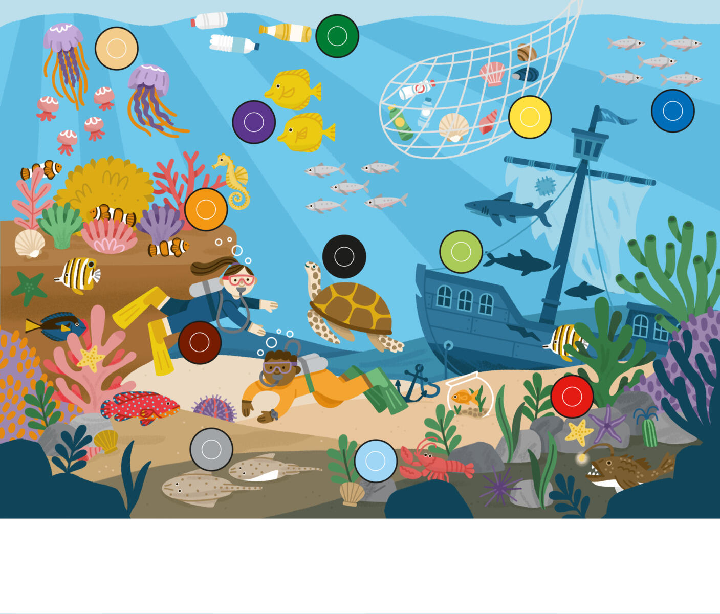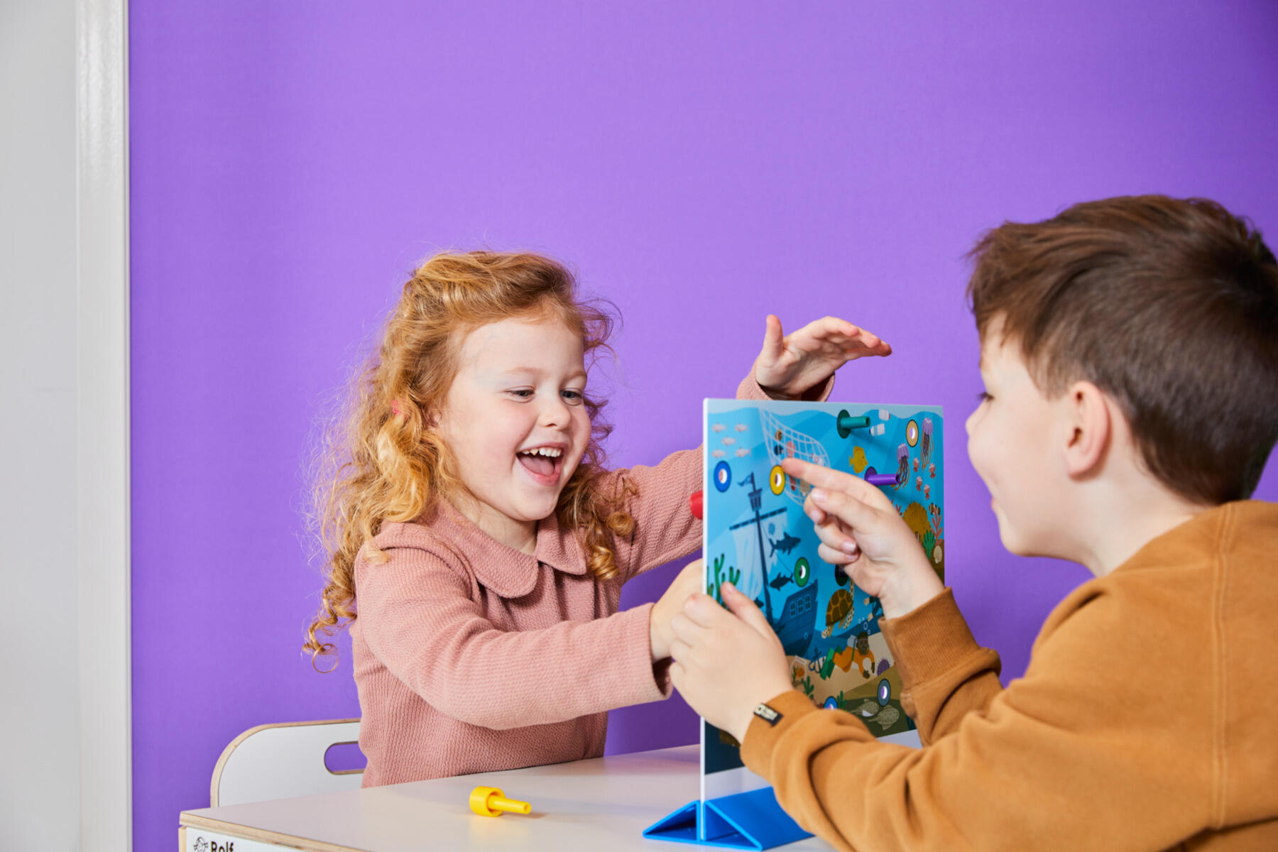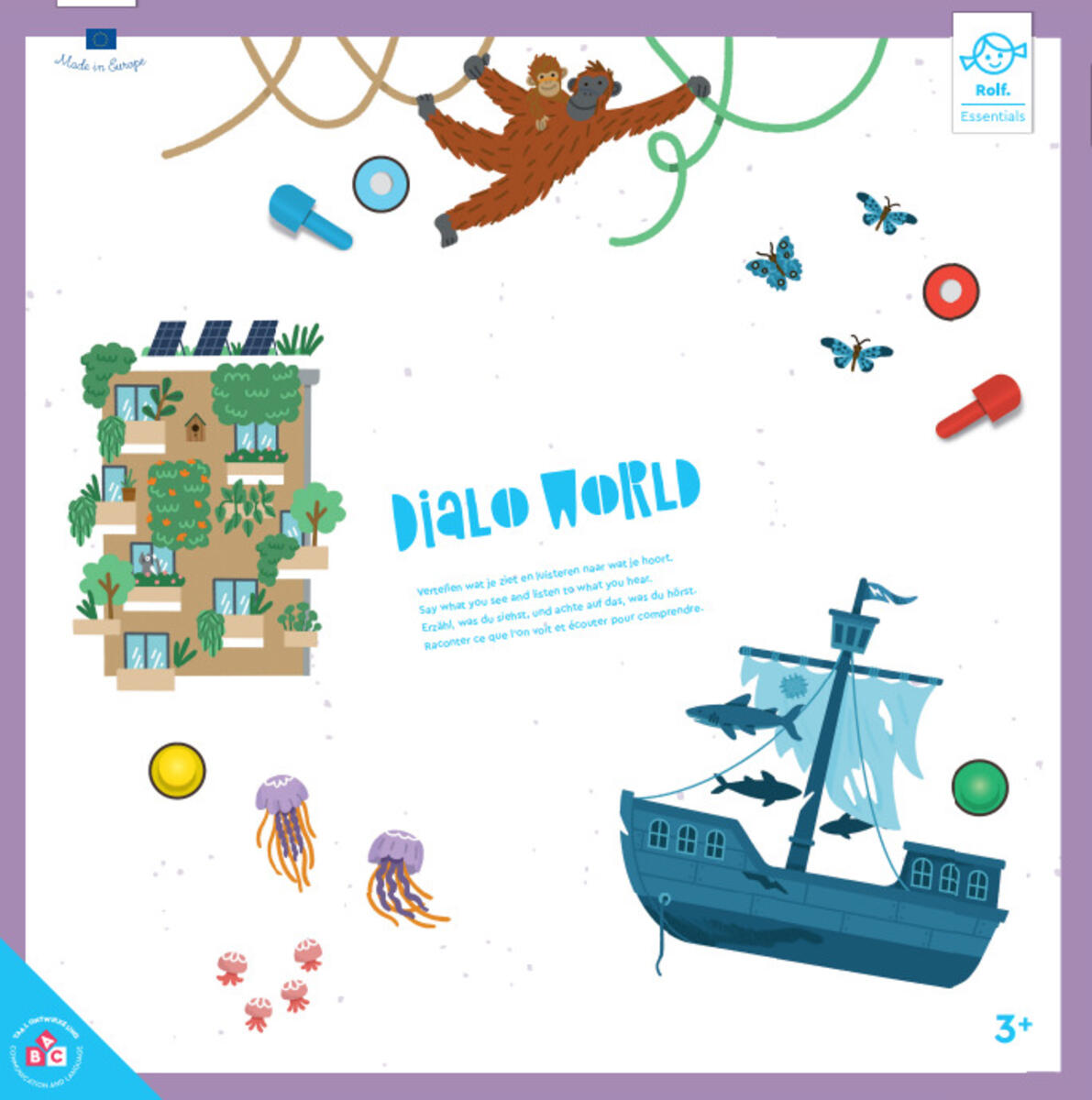 Dialo placeres mellem to børn, som øver sig i at finde de rigtige ord og kommunikere. Det ene barn beskriver et sted på billedet, mens det andet lytter nøje og markerer stedet med en farvet pind. Derefter forsøger man sammen at fylde hele billedet med pinde ved at beskrive så præcist som muligt. Indeholder 3 forskellige motiver (by, havbund og jungle), 12 pinde og et stativ. For 2-4 spillere. Mål: 40 x 32 cm (pladen med billedet). Materiale: PS. PVC-fri. Fra 4 år.