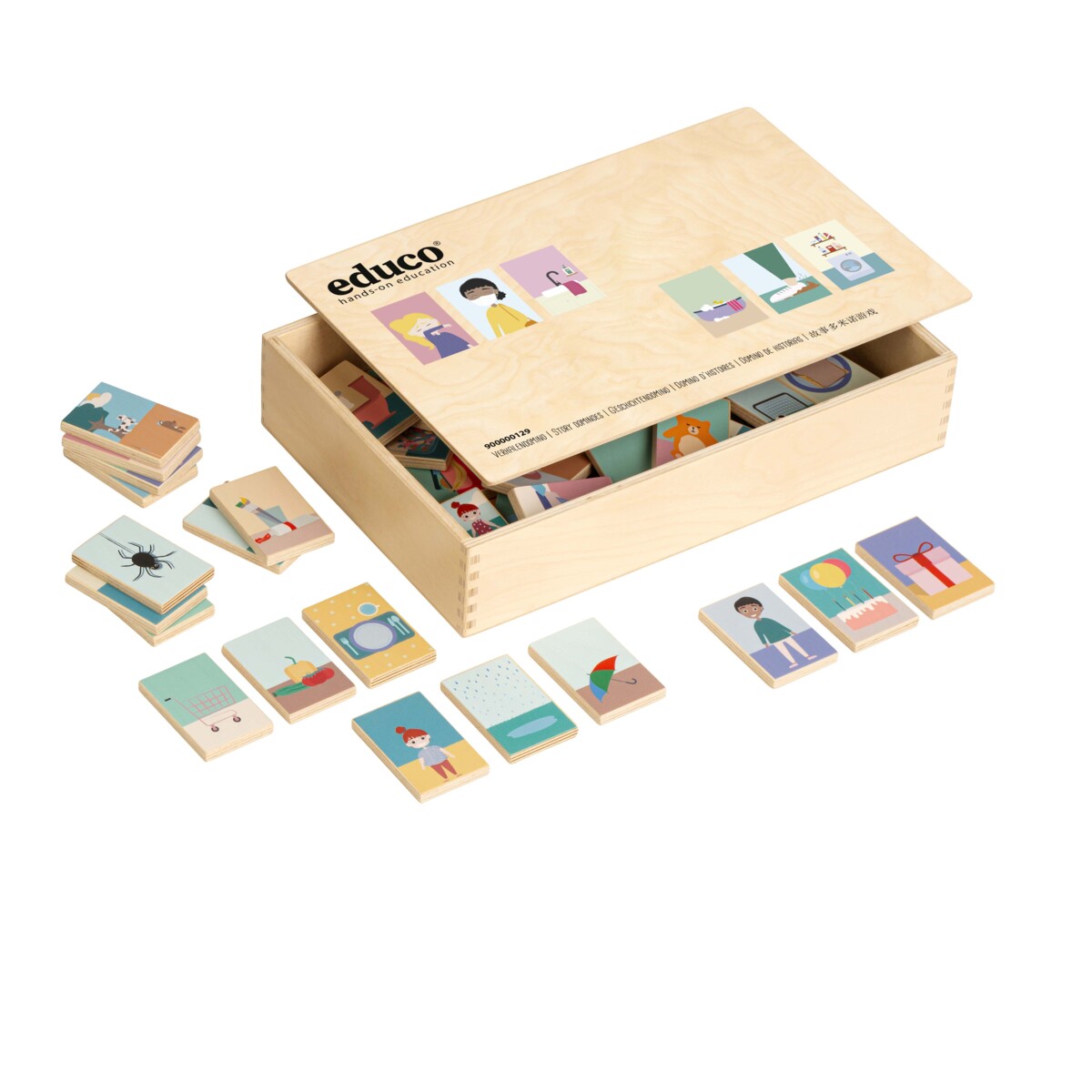 50 træbrikker og 1 trækasse til opbevaring. Placér dominobrikkerne i en rækkefølge efter eget ønske, og fortæl din historie. Stimulerer ordforråd og historiefortælling. Brikkerne viser forskellige emner og kan sorteres efter disse. Eksempler på emner er mennesker, mad og drikke, dyr og aktiviteter. Mål: træbrikker 5x7 cm, trækassen 33,5x22,5x7 cm. Fra 3 år.
