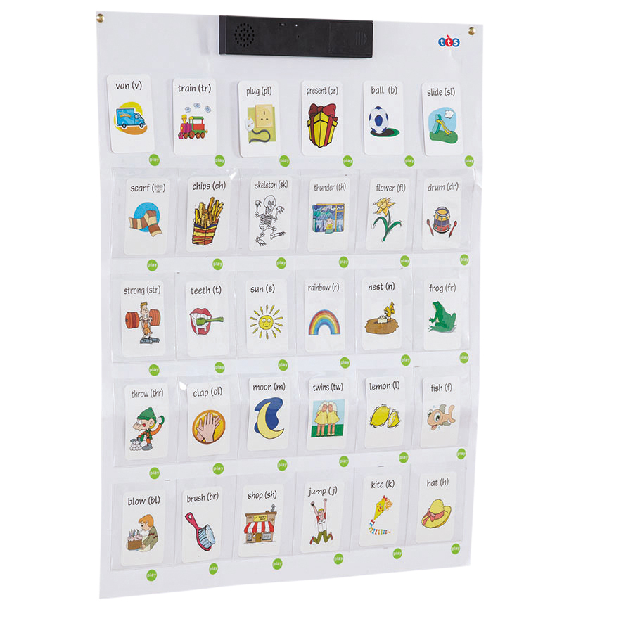 Plakat med 30 lommer designet til interaktiv læring. Til hver lomme kan man indtale 10 sekunders lyd. Sæt en genstand eller et billede i og tilknyt lyd. Mål: 56×65 cm. Fra 3 år.