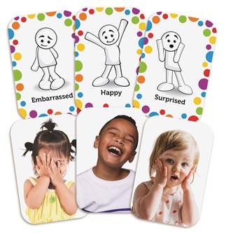 24 billeder af mennesker, som udtrykker forskellige følelser. Lad barnet beskrive følelsen, som vises på billedet og snak om, hvad der kan være sket. Mål: 21x23,5 cm.