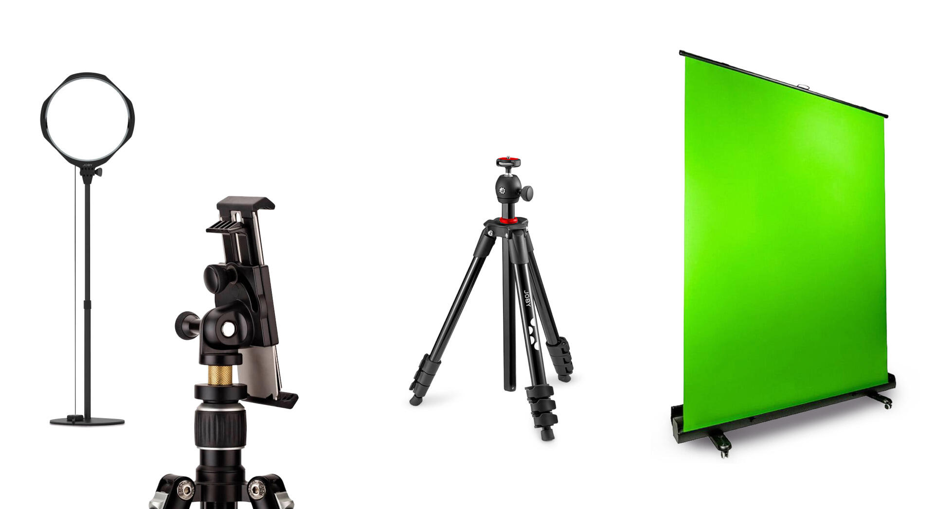Alt hvad I behøver for at kunne bygge et mobilt green screen-studie. Indeholder 168230 Green screen med stativ, 140738 LED-belysning på bordstativ, 137957 Beslag til tabletstativ, 137958 Stativ.