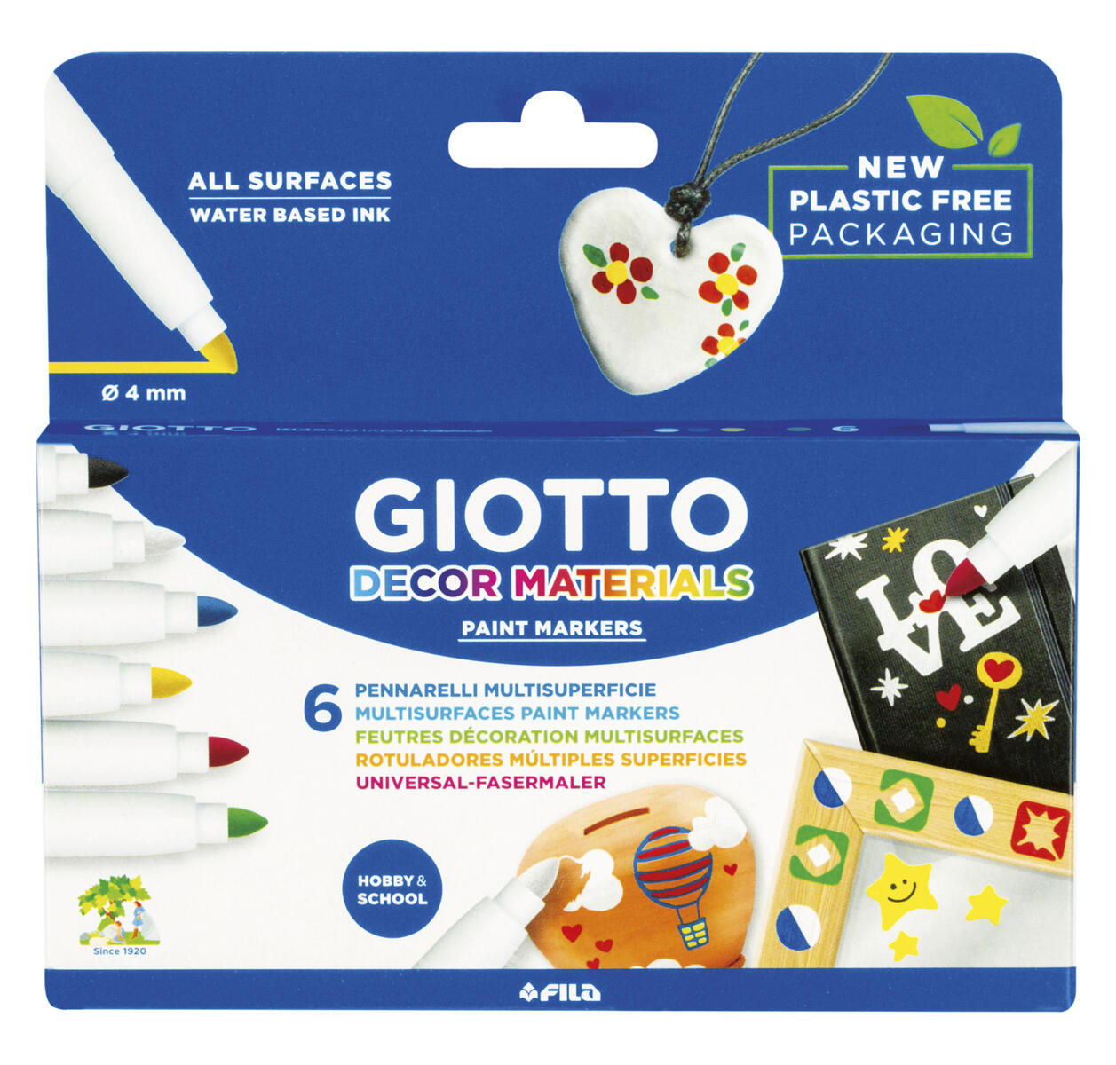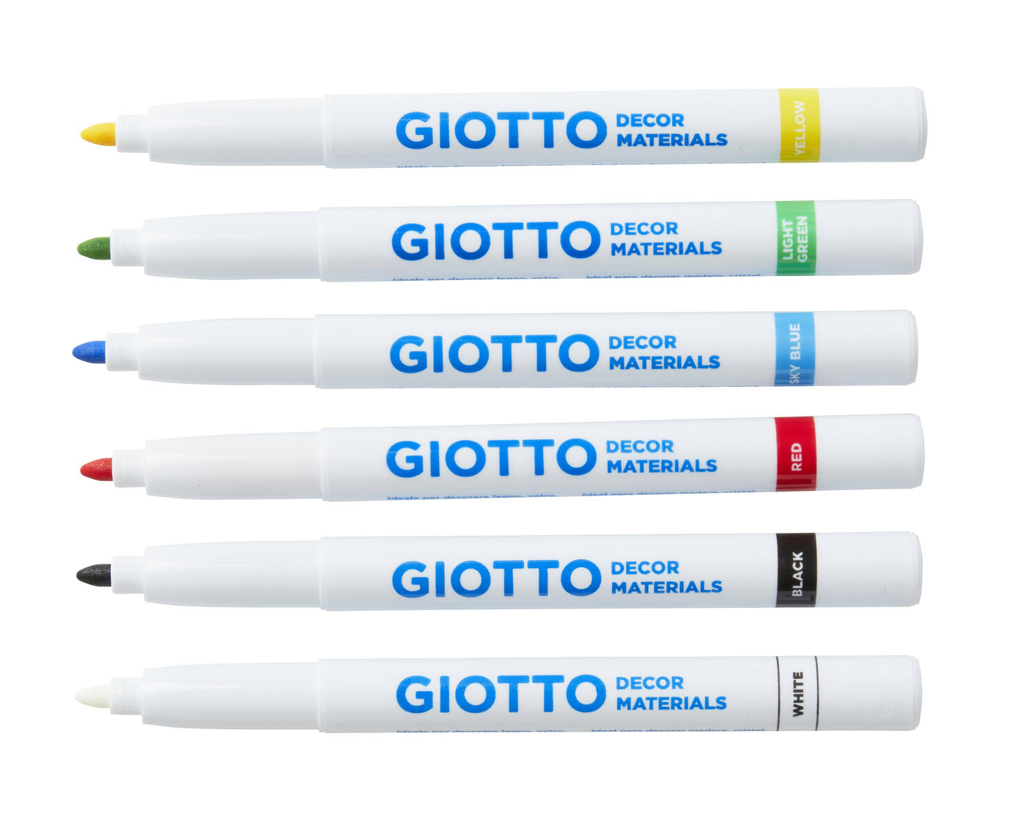 6 stk./pk. Vandbaseret tusch med rigtig god dækkeevne. Mellemtyk spids, lysbestandig. Perfekt til dekorering af karton, træ, glas, læder, keramik, plast, sten og metal. Ventileret sikkerhedshætte. Indeholder: gul, rød, blå, grøn, sort og hvid. Opbevares liggende. Fra 3 år.