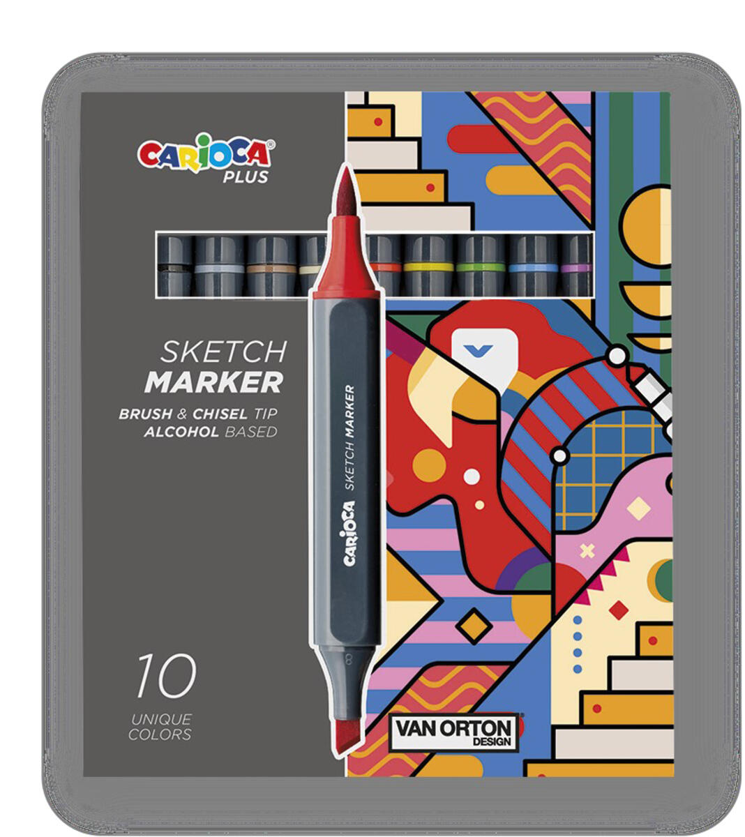 10 stk./pk. Dobbelttuscher med alkoholbaseret blæk, som tørrer hurtigt. Sketch markeren har dobbelt spids: én skrå og én penselspids. Farverne blandes med jævn overgang. Svag lugt. Ergonomisk greb. Indeholder gul, rød, violet, blå, grøn, brun, beige, grå, sort og hvid.