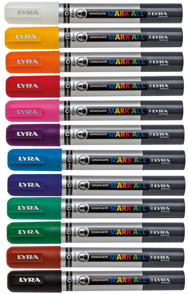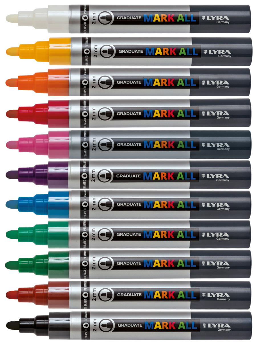 12 stk./pk. Tuscher af høj kvalitet til tegning, dekorering og skrivning. Med vandbaseret blæk, der tørrer hurtigt og bliver vandfast. Egnet til papir, træ, glas, metal og plast. Indeholder ikke xylen eller toluen. Rund spids, streg 2 mm.