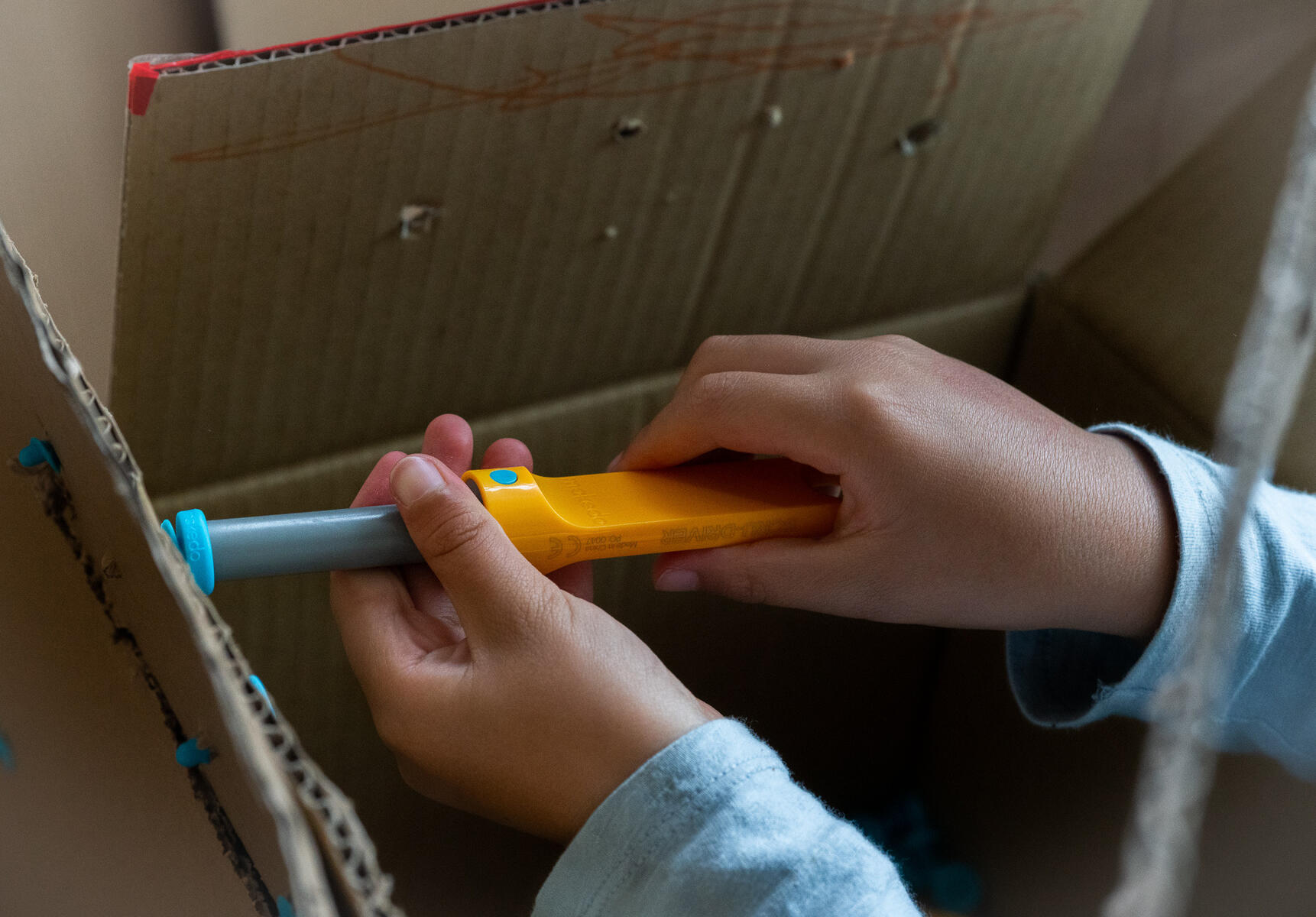 Sav med klinge uden skarpe kanter til savning i pap. Kartonnens kanter bliver bløde, så du ikke skærer dig. Brug savens håndtag til at perforere huller til skærelinjen. Fra 5 år.