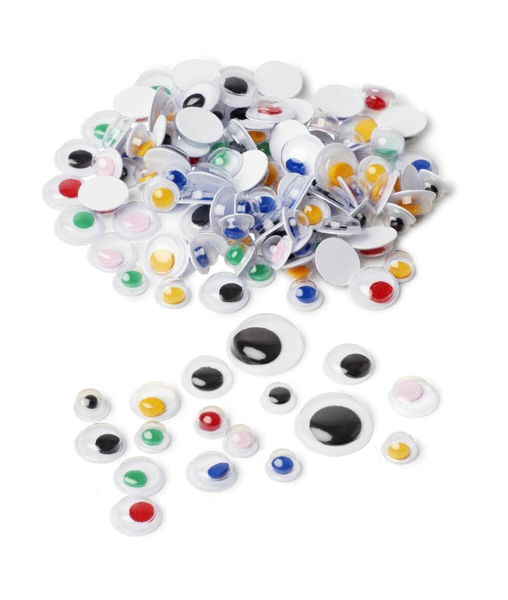 1.100 stk./pk. Hvide plastøjne med bevægelig pupil i sort eller farver. Selvklæbende. Fire størrelser ca. 6–20 mm. Fremstillet af PET og PVC.