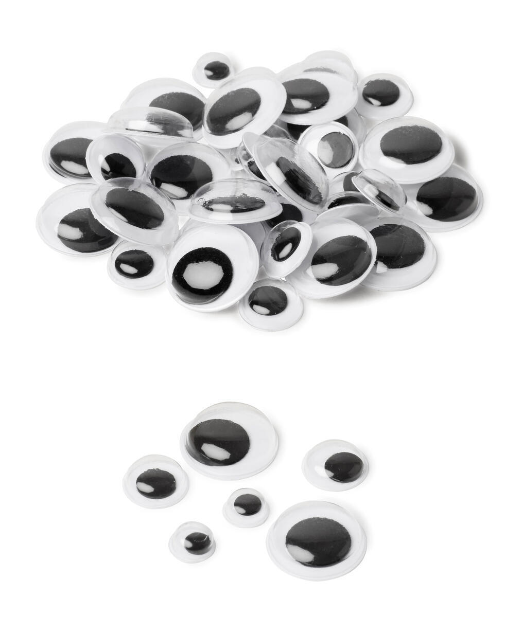 140 stk./pk. Hvide plastøjne med sort bevægelig pupil og vipper. Ikke selvklæbende. 20 stk. Ø15 mm, 50 stk. Ø10 mm og 70 stk. Ø7 mm. Fremstillet af PET.