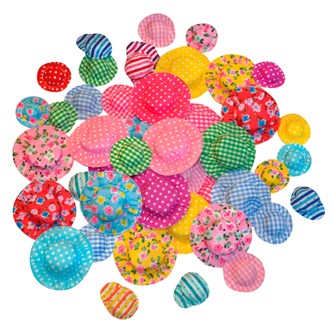 50 stk./pk. Forskellige formpressede miniaturehatte i stof. Til dekoration og hobbyarbejde. I forskellige mønstre og farver.