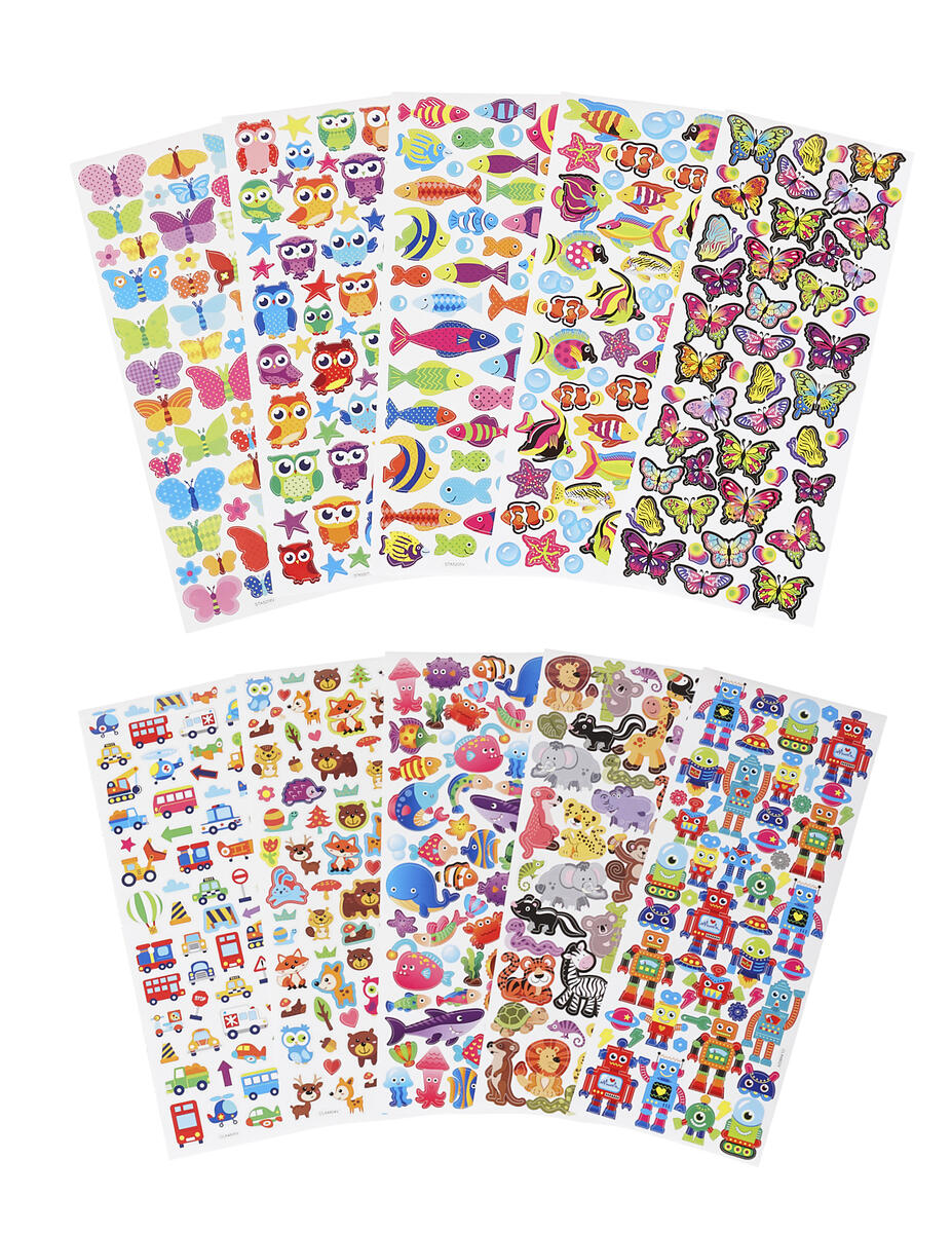 500 stk./pk. 8 ark med klistermærker i forskellige størrelser og motiver som prinsesser, figurer, blomster, både og dyr. Mål: 10–78 mm. Syrefrie. Af papir.