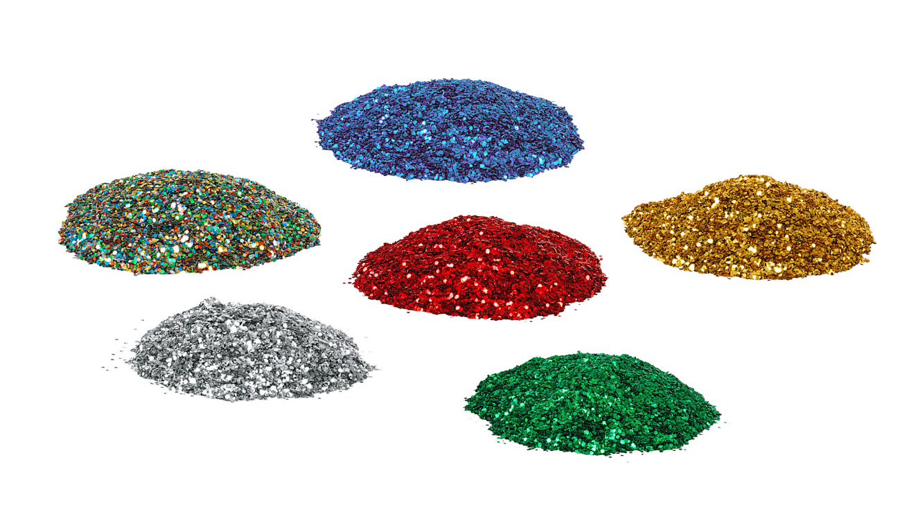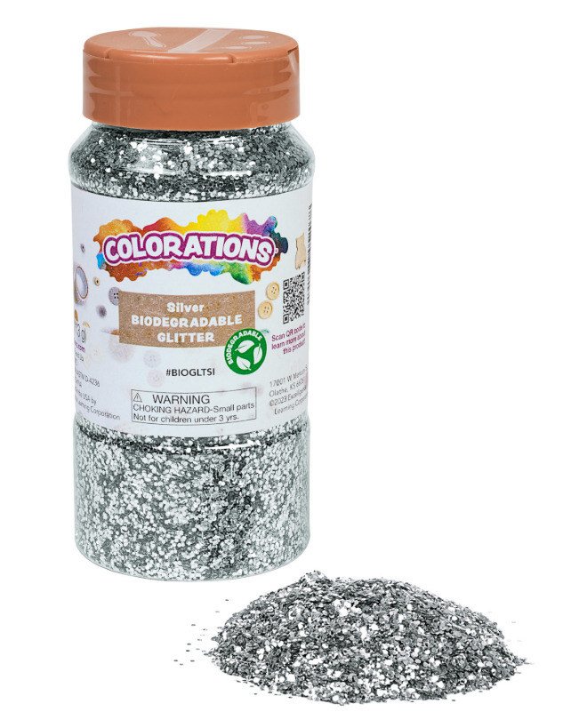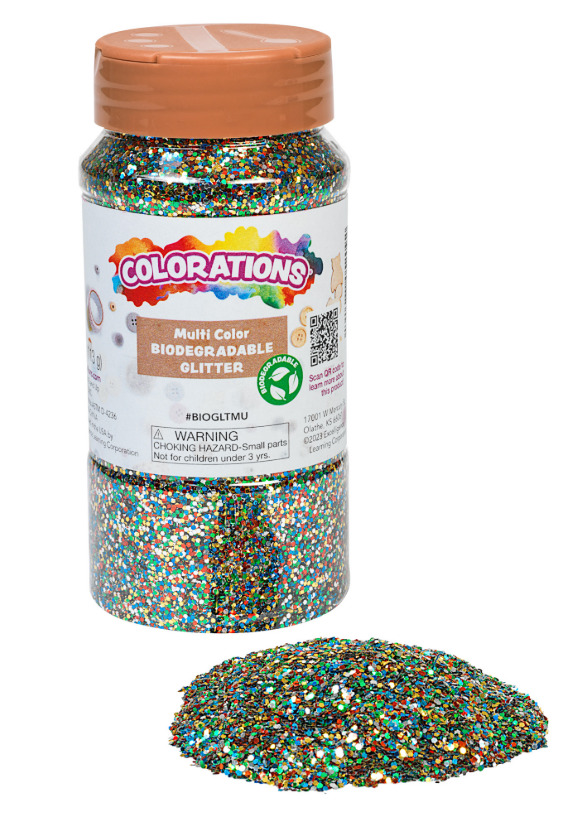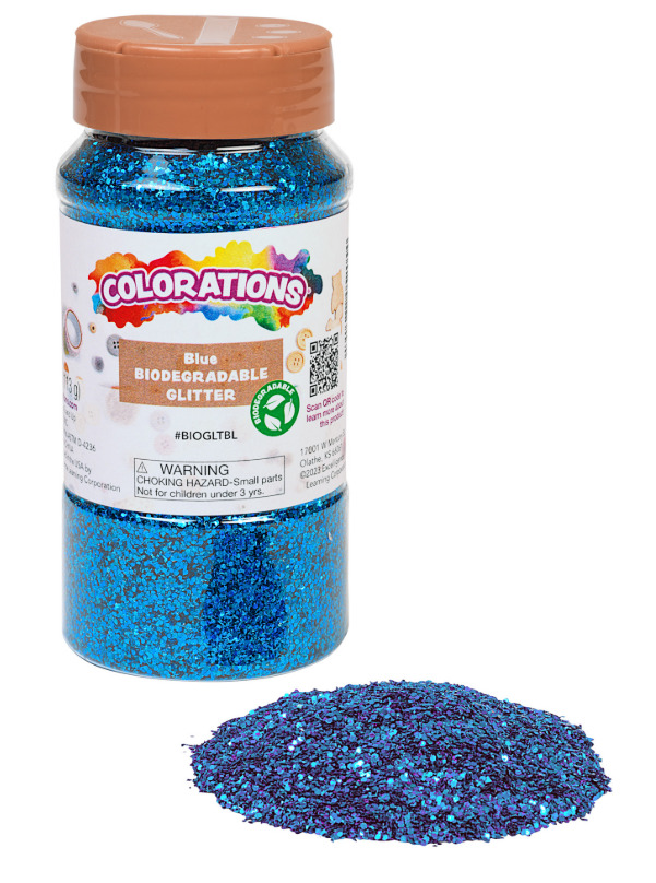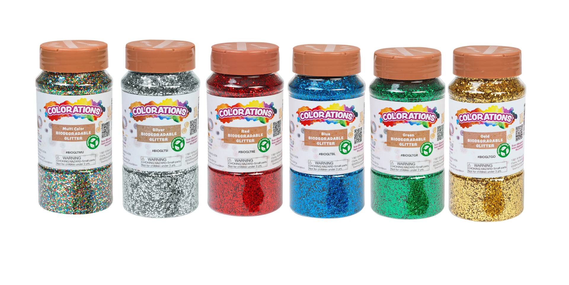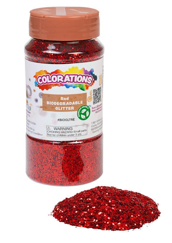 6x20 g. Glitterdrys i klare metalliske farver. Fremstillet i cellulosebaseret og nedbrydelig bioplast. Leveres i strødåse med låg. Indeholder rød, lilla, blå, grøn, guld og sølv. Fra 3 år.