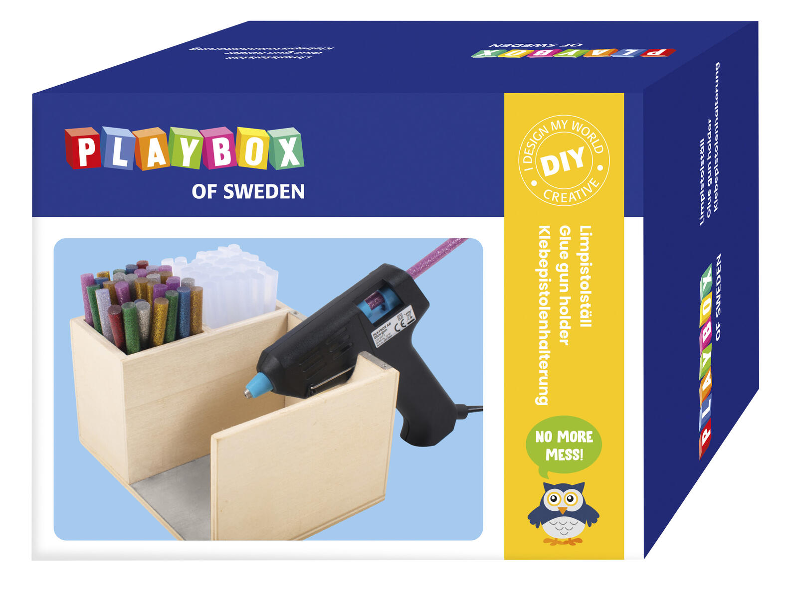 Når man har brug for at sætte limpistolen fra sig, mens man arbejder, står den stabilt i denne holder. Til både små og store limpistoler. 2 rum. Mål 14,5x11 cm. Af træ og metal.