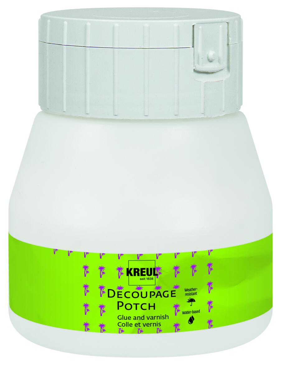 Tørrer med blank overflade. Vandbaseret lak som først lægges under motivet som lim og derefter over som lak og beskyttende overflade. Som motiv kan kan f.eks. servietter eller glansbilleder bruges. Passer til de fleste underlag, f.eks. papir, træ, æsker, lærred og styropor.
