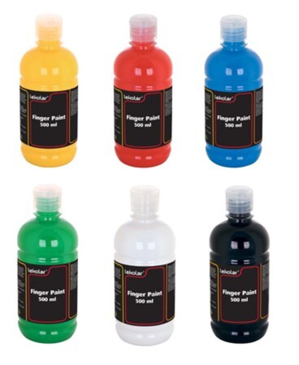 6x500 ml. Vandbaseret, cremet fingerfarve. Mat og hurtigtørrende med god dækkeevne. Plastflasker med kliklåg. Pletter fjernes med lunkent vand og mild sæbe. Fri for æg, gluten og laktose. Indeholder gul, rød, blå, grøn, sort og hvid. Børn under 3 år bør være under opsyn. PVC-fri.