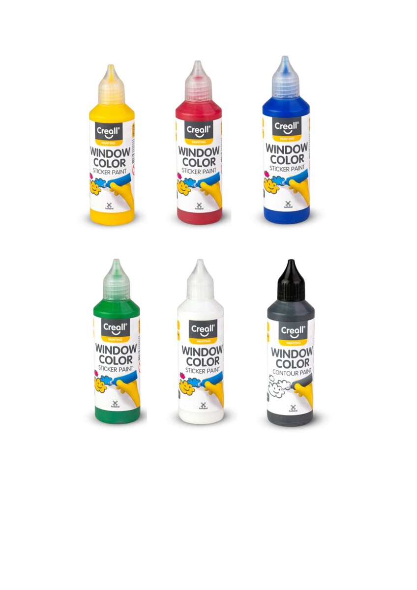 6x80 ml/pk. Vandbaseret, transparent farve, der lader lyset skinne smukt igennem på glas og klar plast. Anvendes på plastfilm, hvor motivet efter tørring kan fjernes og placeres på plane overflader som vinduer og glas. Hæfter ikke permanent og kan flyttes flere gange. Tørretid for farve ca. 24 timer og for konturfarve ca. 3 timer. Leveres i flasker med tud for nem påføring. Indeholder: gul, rød, blå, grøn og hvid farve samt sort konturfarve.