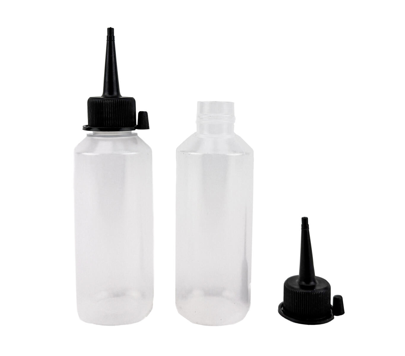 Gennemsigtig plastflaske med spids tud til lim og maling. Spidsen klippes til i passende længde afhængig af indholdet. Rummer 250 ml. Fremstillet af polypropylen.