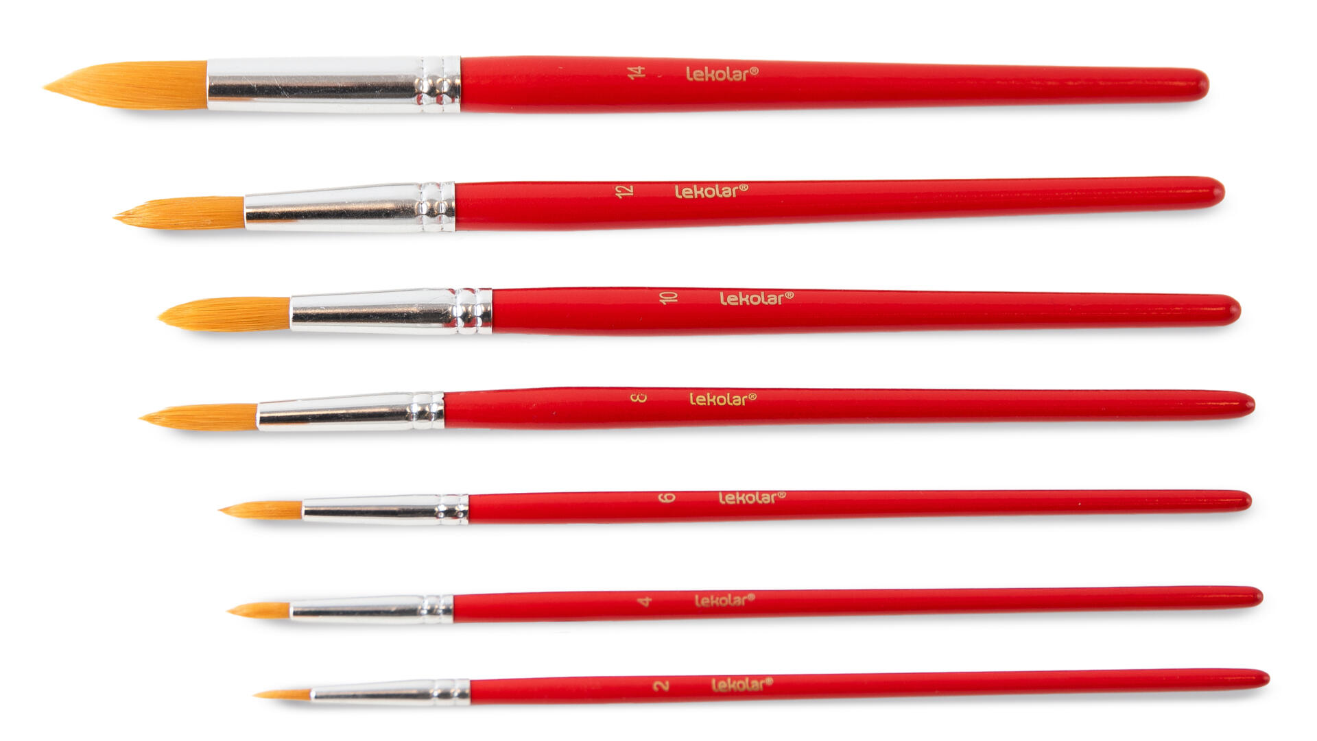 12 stk./pk. Holdbare skolepensler med tæt og fin syntetisk børste og spids top. Passer til både tyndt- og tyktflydende maling: akvarel, gouache/tempara, akryl og oliemaling. Børsten har en god form og kan bruges til store linjevariationer, fra meget tynde til fyldige linjer. Kort, rødlakeret træskaft og aluminiumsmanchet.